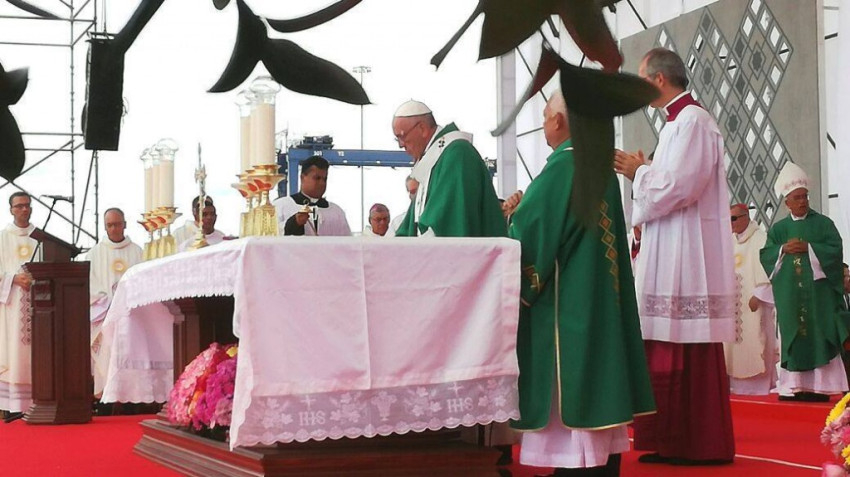 Itt, Claver Szent Péter kegyhelyén, ahol állandóan és rendszeresen van találkozó, reflexió az emberi jogok fejlődéséről és érvényesüléséről Kolumbiában, ma Isten szava megbocsátásról, feddésről, közösségről és imádságról beszél nekünk.
