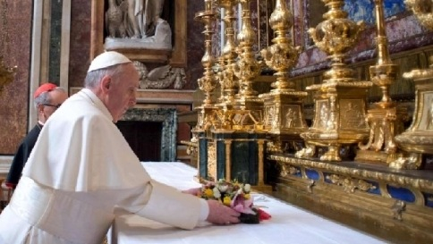 A Szentatya augusztus 13-án, szerdán délelőtt 11 órakor magánlátogatást tett kíséret nélkül a római Santa Maria Maggiore-bazilikában, ahol közel 20 percig csendes imába merült a Salus Populi Romani Mária-ikon előtt, és egy virágcsokrot helyezett el az oltáron – tette közzé a hírt a szentszéki szóvivő.