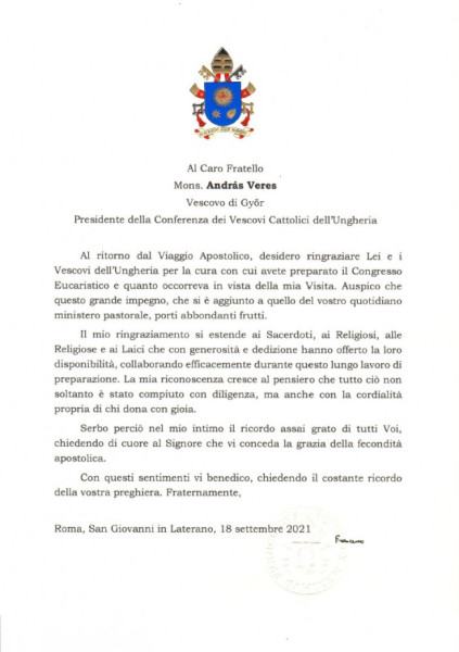 Visszatérve az apostoli útról szeretném megköszönni Önnek és a magyar püspököknek azt a gondosságot, amellyel az Eucharisztikus Kongresszust és mindazt, ami látogatásomhoz szükséges volt, előkészítették. Bízom abban, hogy ez a nagy szolgálat, társulva a mindennapi lelkipásztori szolgálattal, bőséges gyümölcsöt fog hozni.