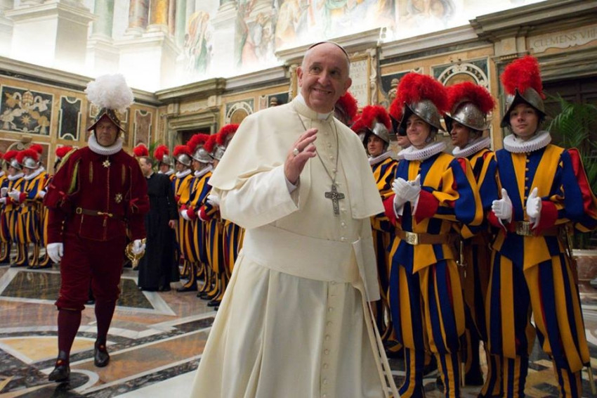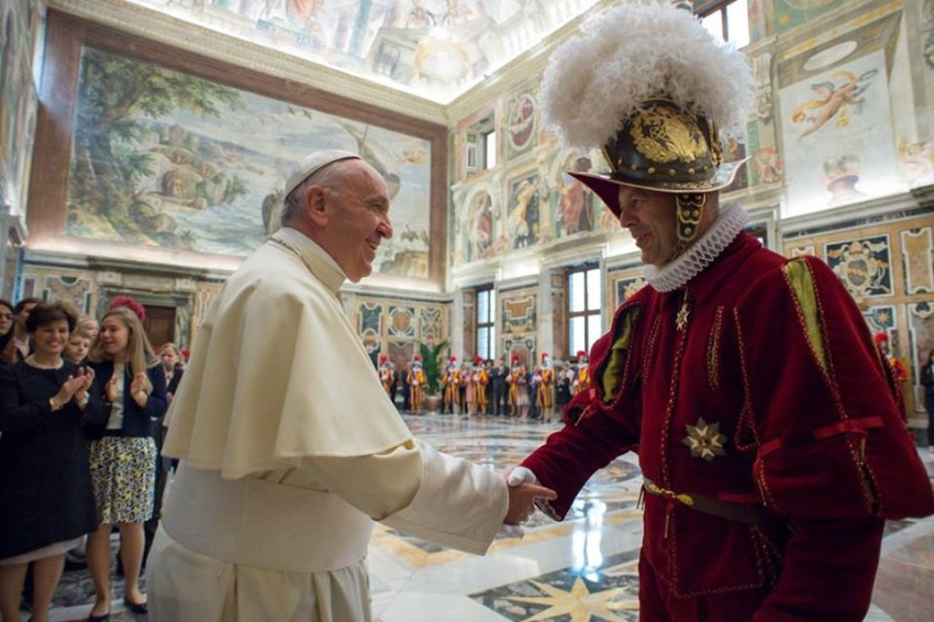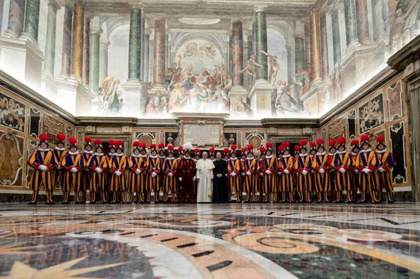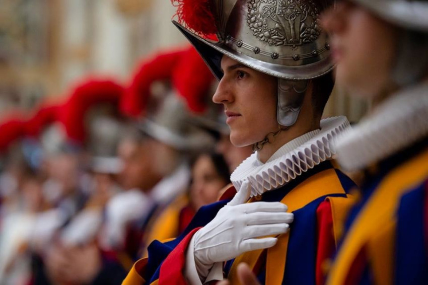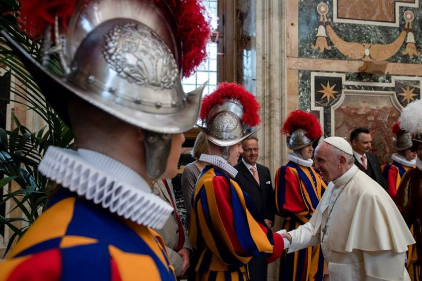 A Svájci Gárda 1527. május 6. óta szolgálja hűségesen a római pápát, a mai gárdisták elődei életüket áldozták Róma védelmében, amikor a várost kifosztották. Az akkori hőstett állandó felhívás a mai testület számára is, hogy következetesen éljék meg a katolikus hitet; legyenek állhatatosak a Jézussal való barátságban és az Egyház iránti szeretetben; hogy örömmel és szorgalommal végezzék a kisebb és nagyobb hétköznapi feladataikat; és hogy bátran, türelemmel, nagylelkűen és szolidárisan forduljanak mindenkihez – buzdított a pápa. – Ezek az erények kell, hogy jellemezzék a gárdistákat, miközben díszőrséget állnak és a Vatikán biztonságára ügyelnek, de akkor is, amikor levetik az egyenruhát. A Pápai Svájci Gárda ugyanis mindig szolgálatban van, akkor is, amikor éppen nem!