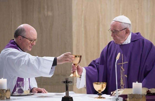 Érezzük az ügyet a magunkénak, harcoljunk érte, haladjunk előre és böjtöljünk. Az Úr adja meg nekünk a kegyelmet, hogy szabadon imádkozzunk őelőtte, mint az ő gyermekei. Hogy kitartóan, türelemmel imádkozzunk. De legfőképpen azt, hogy úgy imádkozzunk, hogy tudjuk: az Atyával beszélünk, és ő meghallgat minket. Az Úr segítsen minket fejlődni ebben a közbenjáró imában! – zárta csütörtök reggeli homíliáját a pápa.