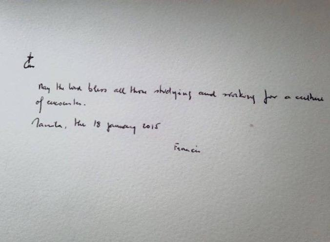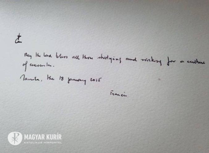 Ferenc pápa bejegyzése a Szent Tamás Egyetem emlékkönyvében