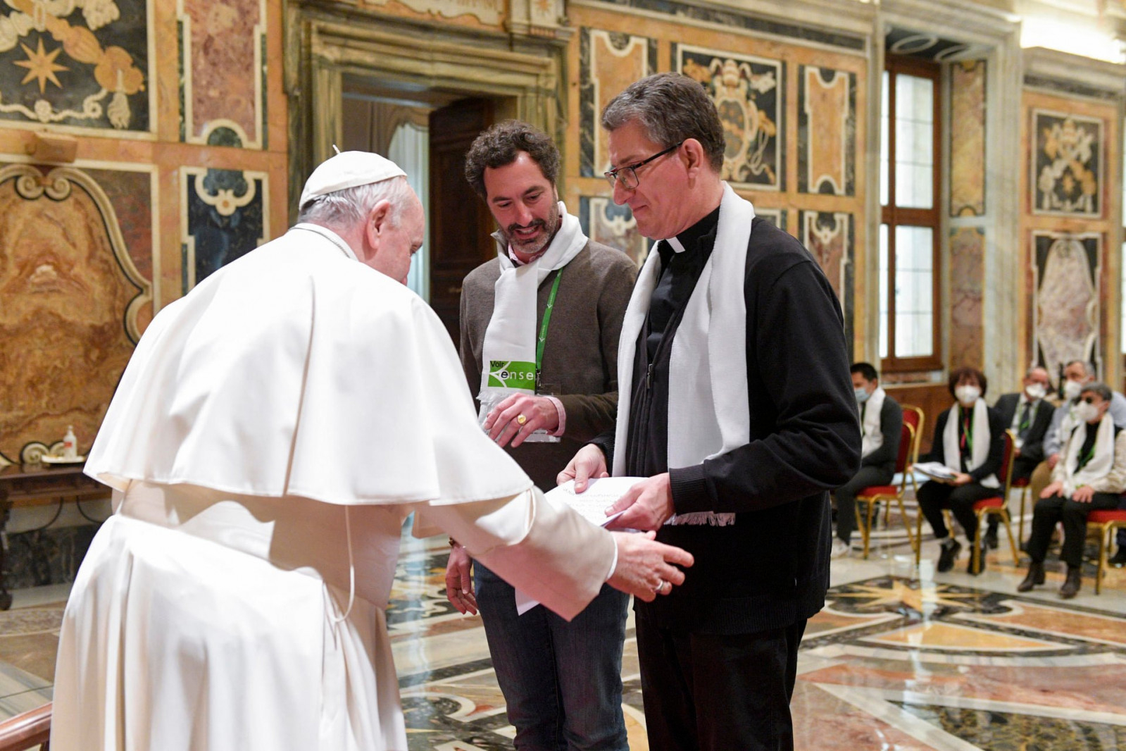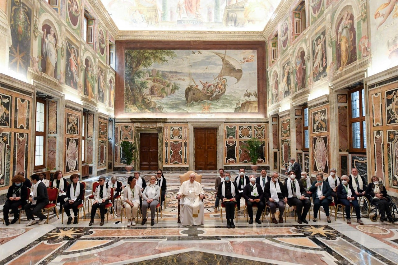 Köszöntelek mindannyiatokat, a Voir Ensemble Egyesület tagjait, akik ezt a római zarándoklatot megszerveztétek. Egyesületetek sok vak és látássérült embert gyűjt egybe, akik együtt akarnak járni, hogy testvériesen éljék meg az evangélium örömét. Köszönöm az elnök úr kedves szavait, és üdvözlöm a Voir Ensemble minden tagját.