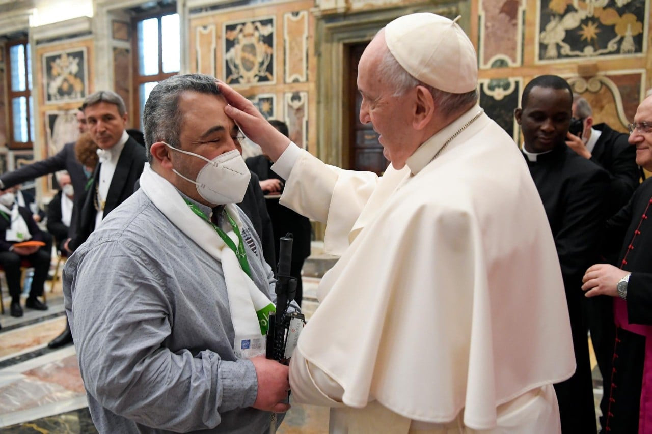 Zarándoklatotok annak a jele, hogy a fogyatékkal élő hívők teljesen részt vesznek az Egyház közösségében. Ezt szem előtt tartva szeretnék megosztani veletek egy rövid elmélkedést Isten igéjéről: a vakon született emberrel találkozó Jézus jelenetéről (vö. Jn 9,1–41), összhangban egyesületetek, a Voir Ensemble [Lássunk együtt!] nevével.