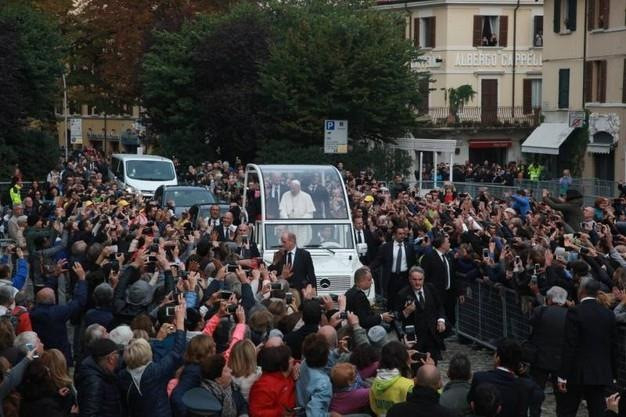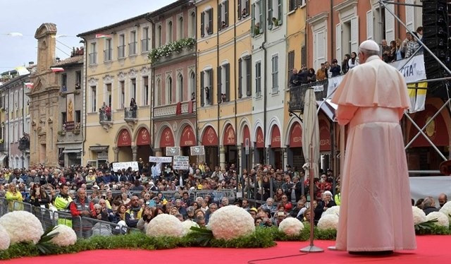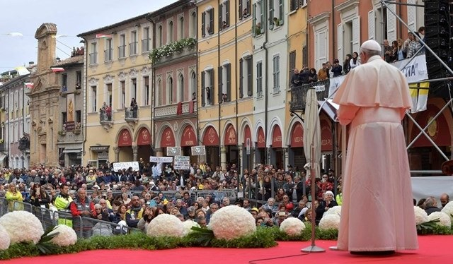 Ferenc pápa Cesena főterén találkozott a lakossággal. Üdvözlő beszédében utalt a város gazdag történelmi múltjára, felidézve két illusztris szülöttje, VI. Piusz és VII. Piusz pápák alakját.