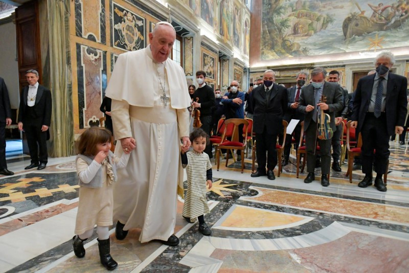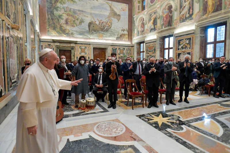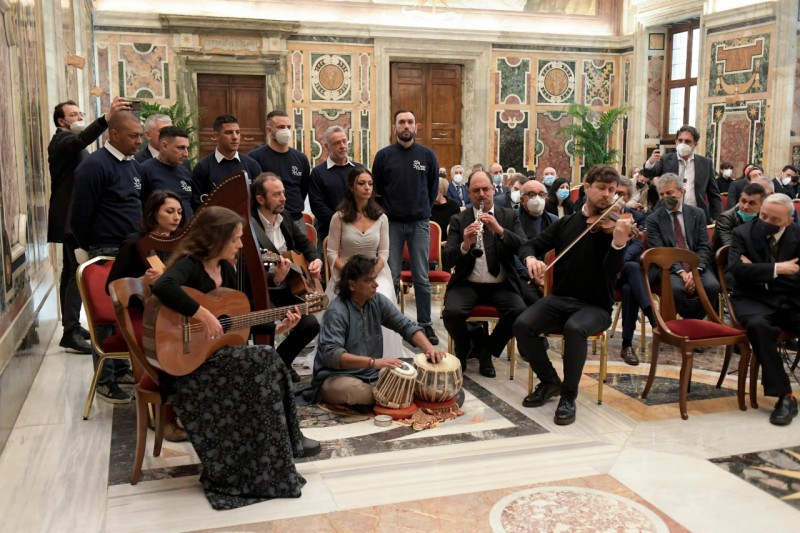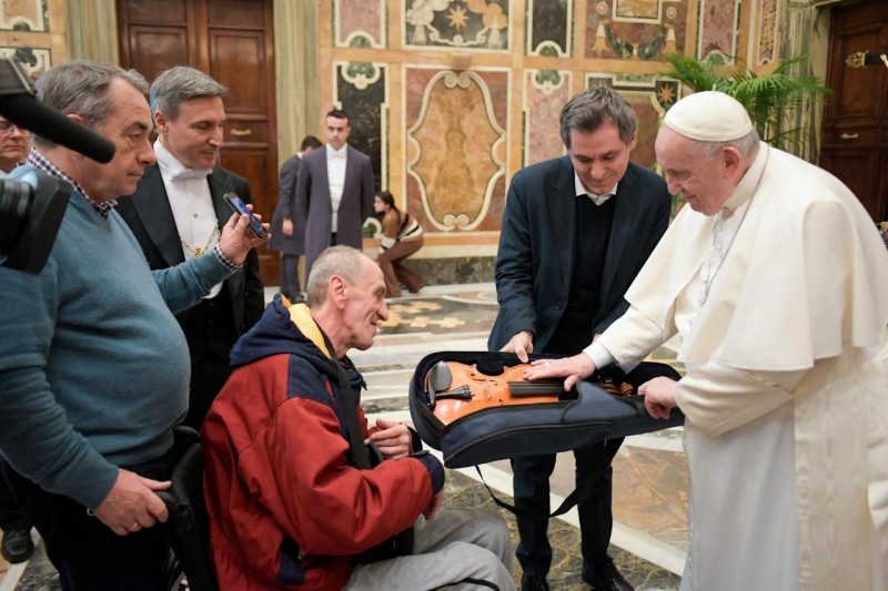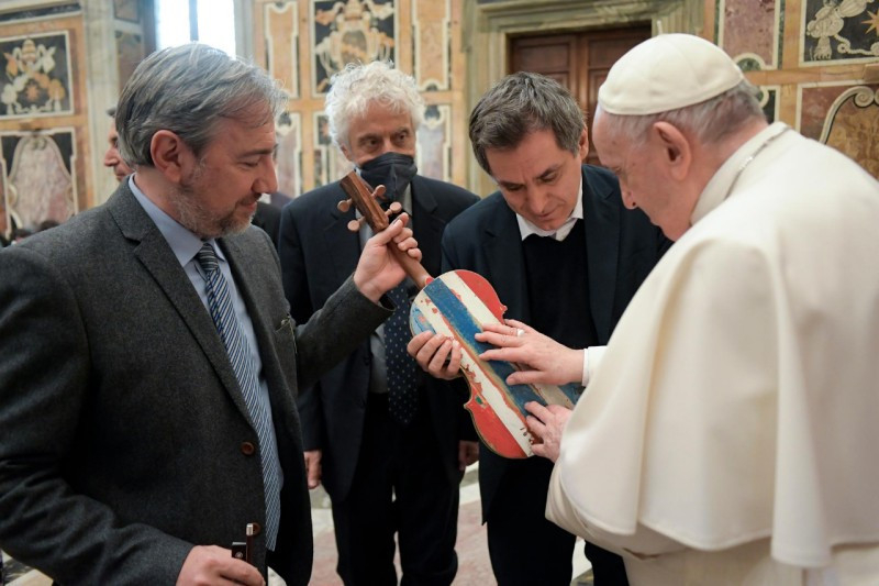 Az audiencia a Tenger hegedűje című zenemű előadásával zárult, amelyet Nicola Piovani komponált és amelyet a többnemzetiségű zenekar zenészei adtak elő, a migránsok csónakjainak faanyagából készült hegedűt is megszólaltatva. „Még egyszer köszönöm, és arra buzdítalak benneteket, hogy folytassátok ezt az utat” – mondta a pápa. „Legyen mindig jelen köztetek és műhelyeitekben a názáreti ház lelkülete!”