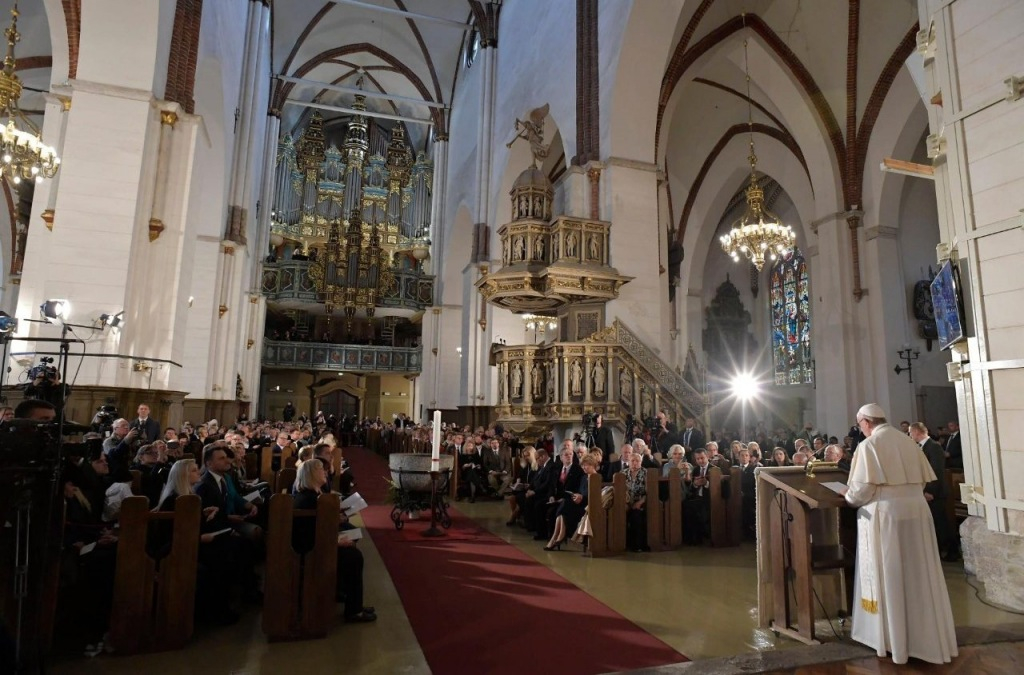 Köszönöm Jānis Vanags érseknek, hogy megnyitotta előttünk e ház kapuját, hogy megtarthassuk imatalálkozónkat. Ez a „székesegy-ház”, mely több mint nyolcszáz év óta látja vendégül e város keresztény életét, hűséges tanúja annak, hogy sok testvérünk jött ide imádkozni, Istent imádni, fenntartani a reményt a szenvedésekkel teli időkben és bátorságra lelni az igazságtalansággal és fájdalommal teli időkkel való megbirkózáshoz. Ma minket lát vendégül ez a ház, hogy a Szentlélek „kétkezi munkásként” a közösség kötelékeit szője közénk, és ezáltal minket is az egység „kétkezi munkásaivá” tegyen a ránk bízottak között, hogy a különbözőségek ne okozzanak szakadásokat. Engedjük, hogy a Szentlélek felvértezzen minket a párbeszédnek, a megértésnek, a kölcsönös tisztelet és a testvériség keresésének fegyvereivel (vö. Ef 6,13–18).