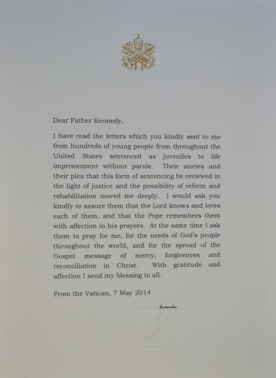 Elolvastam az Ön által továbbított leveleket, amelyeket egyesült államokbeli fiatal elítéltek írtak, akiket életfogytiglanra ítéltek fiatalkorú bűnözésért, a feltételes szabadlábra helyezés esélye nélkül. Mélyen megindítottak az élettörténeteik és a könyörgésük, hogy ezt a büntetéstípust vizsgálják felül az igazság, a reform és a rehabilitáció lehetőségének fényében. Nagyon kérem, erősítse meg őket benne, hogy Isten ismeri és szereti mindegyiküket, és a pápa imáiban szeretettel emlékezik meg róluk. Ugyanakkor én is kérem őket, hogy imádkozzanak értem, imádkozzanak Isten népének szükségleteiért az egész világon, és az Evangélium üzenetének terjedéséért, ami a könyörület, a megbocsátás és kiengesztelődés Krisztusban. Hálával és szeretettel küldöm áldásomat mindannyiójukra.