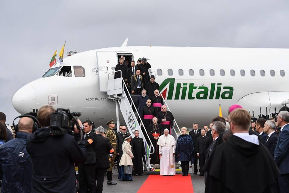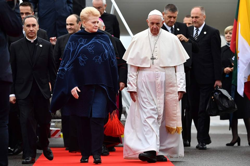 Szombaton reggel fél nyolckor indult a pápai repülőgép Rómából, és helyi idő szerint fél tizenkettőkor landolt a litván főváros, Vilnius repülőterén. A fogadási ceremónia után a pápa udvariassági látogatást tett a litván elnöknél, majd a politikai élet, a civil társadalom és a diplomáciai testület képviselőivel találkozott az elnöki palota előtti téren, beszédet intézve hozzájuk.