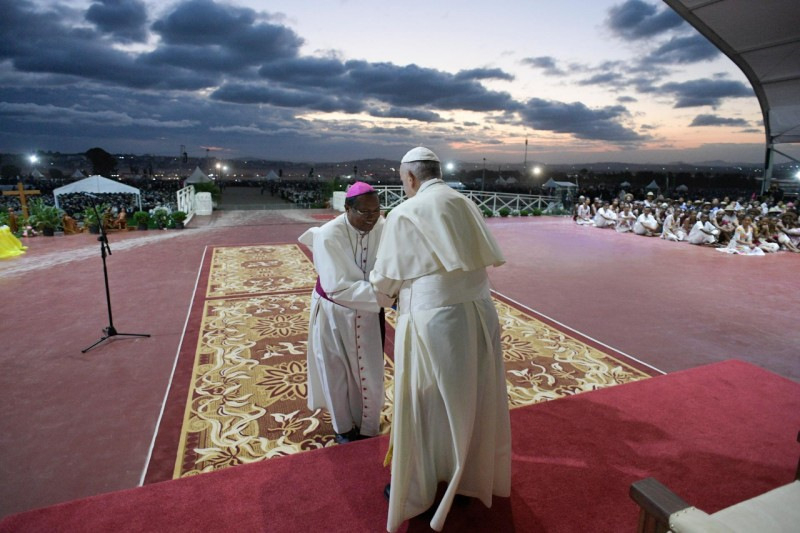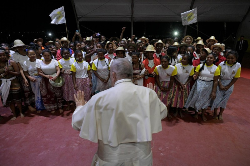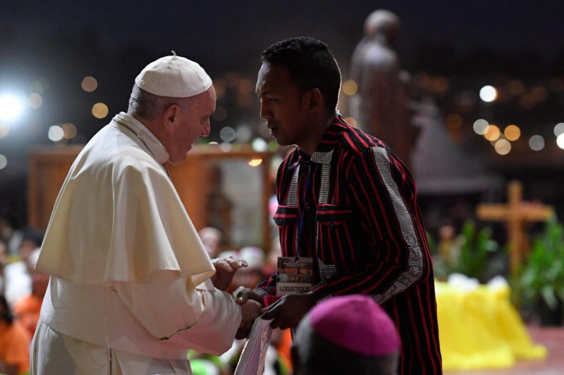 Rajtatok keresztül lép be a jövő Madagaszkárra és az Egyházba. Az Úr elsőként bízott bennetek, és arra hív, hogy ti is bízzatok benne, bízzatok a készségeitekben és a képességeitekben, amelyekből sok van. Arra hív, hogy legyetek bátrak, egyesüljetek vele, hogy megírjátok életetek legszebb lapját, hogy legyőzzétek a bágyadtságot és Rovához hasonlóan keresztény választ adjatok arra a sok problémára, amivel szembe kell néznetek. Az Úr arra hív, hogy legyetek a jövő építői (vö. uo., 174). Ti lesztek a jövő építői! Arra hív, hogy járuljatok hozzá a jövőhöz azzal, amit csak ti tudtok adni, az örömmel és a hitetek frissességével. Mindannyiatoktól – tőled, tőled, tőled, tőled… – azt kérdezem, és arra hívlak, kérdezd meg te is magadtól: Számíthat rád az Úr? A madagaszkári nép számíthat rád? A hazád, Madagaszkár számíthat rád?