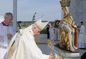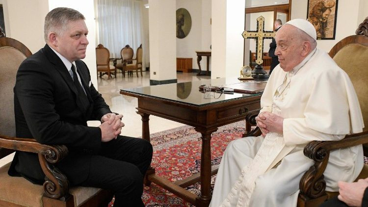 A szlovák miniszterelnök Szent Cirill és Szent Metód bronz szobrát és egy szlovák festő Őrangyalt ábrázoló táblaképét nyújtotta át Ferenc pápának.