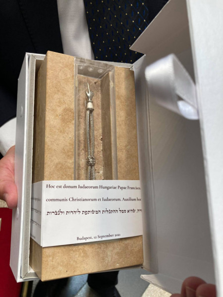 Ferenc pápa a MEÖT tagjaitól a vizsolyi biblia fakszimile kiadását kapta ajándékba, míg a magyarországi zsidóság ajándékaként egy süttői márványba (mészkőbe) helyezett ezüst tóramutatót nyújtottak át az egyházfőnek, amelyet a holokauszt-túlélő családból származó zsidó ötvösművész, Havas Zsuzsa készített. A papírra nyomtatott szöveg héberül és latinul a tóramutató jelentőségét magyarázza, illetve azt tartalmazza, hogy ez a magyar zsidóság ajándéka Ferenc pápának.