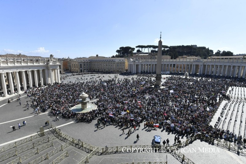 Most pedig köszöntelek benneteket, rómaiak, Olaszországból és sok más országból érkezett zarándokok. Külön is köszöntöm a bulgáriai Veliko Tarnovo gyermekkórusát és a mexikói fiatalok csoportját; továbbá a biadenei és a caonadai fiatalokat. Üdvözlöm a Szeplőtlen Szűzanya-plébánia fiataljait is!