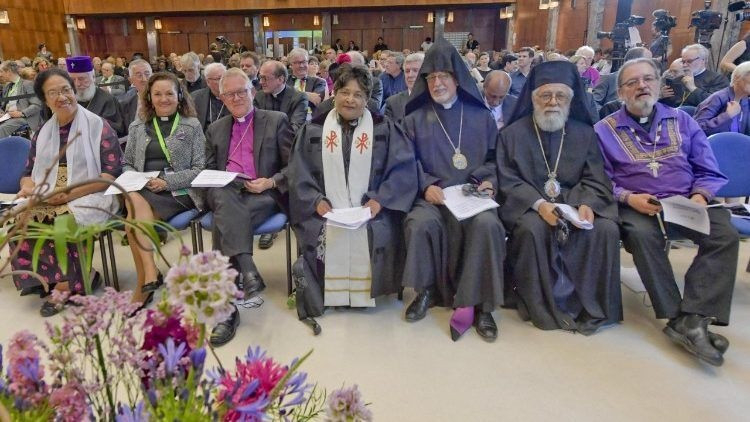 Együtt dolgozni: Ezzel kapcsolatban szeretném kiemelni, hogy a Katolikus Egyház elismeri annak a munkának a különös fontosságát, amelyet a Hit és Egyházszervezet Bizottság végez, és szeretne továbbra is hozzájárulni ahhoz, magasan képzett teológusok részvételével. Azzal, hogy a Hit és Egyházszervezet az Egyház közös vízióját keresi, és hogy erkölcsi és etikai kérdések vizsgálatát végzi, az ökumenikus kihívás neuralgikus pontjait érinti. Hasonlóképpen, a tevékeny jelenlét a Missziói és Evangelizációs Bizottságban, az együttműködés a Vallásközi Párbeszéd és Együttműködés Hivatalával, legutóbb a békére nevelés fontos témájáról, az ökumenikus imahét szövegeinek közös előkészítése és más hasonló közös munkák szilárd és dicséretes együttműködés lényegi elemei. Továbbá nagyra értékelem a Bosseyi Ökumenikus Intézet nélkülözhetetlen szerepét pasztorális és oktatási vezetők fiatal nemzedékeinek ökumenikus képzésében sok keresztény egyház és felekezet számára az egész világon. A Katolikus Egyház sok év óta együttműködik ebben az oktató tevékenységben egy katolikus professzor jelenlétével a fakultáson, és minden évben örömömre szolgál üdvözölni azoknak a hallgatóknak a csoportját, akik tanulmányi látogatásra érkeznek Rómába. Szeretném megemlíteni, mint az „ökumenikus egymásra találás” jó jelét, a teremtett világgal való törődés világnapjához való növekvő csatlakozást.