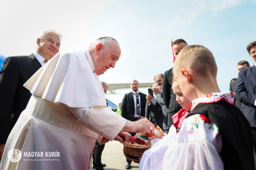 Ferenc pápát üdvözölte több tucat gyermek is, akik a Katolikus Egyház világi munkatársainak gyermekei, közülük ketten frissen sült kenyeret és sót adtak át a Szentatyának.