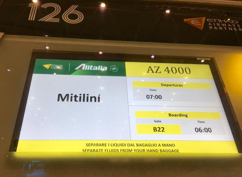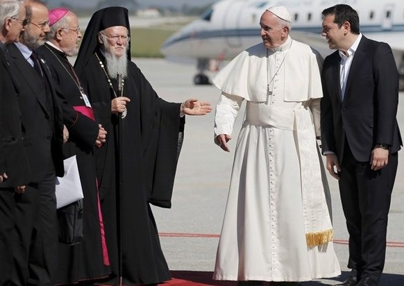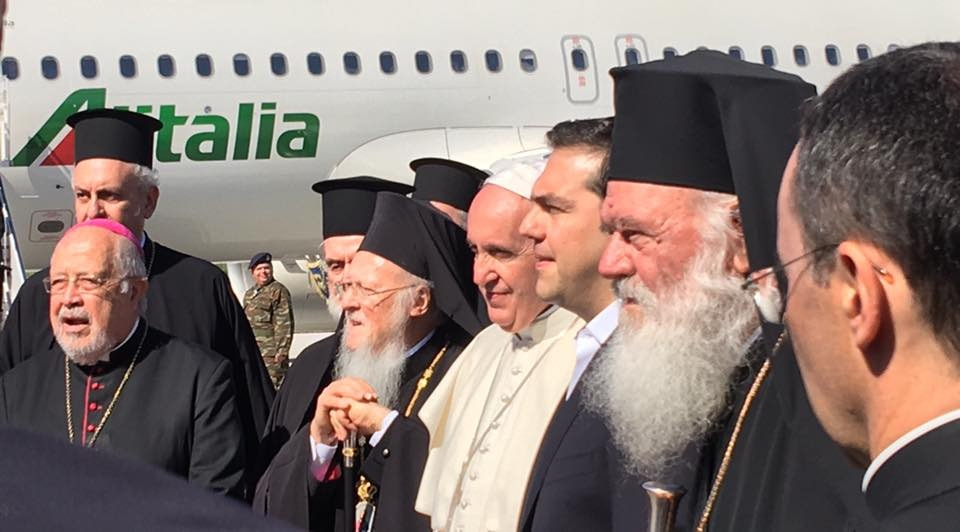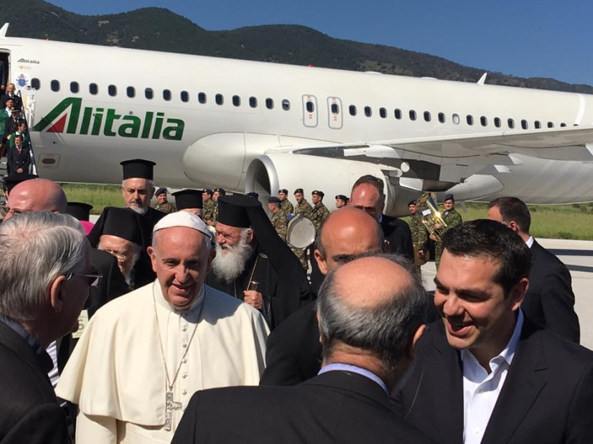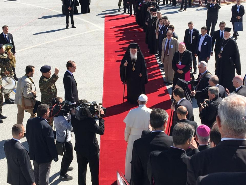 A repülőtéren Alekszisz Ciprász görög miniszterelnök fogadta a pápát, majd Bartolomeosz konstantinápolyi ökumenikus pátriárka és Jeromos athéni ortodox érsek köszöntötte őt testvéri csókkal. Katolikus részről Fragkiszkosz Papamanólisz ferences püspök, a görög katolikus püspöki konferencia elnöke üdvözölte a Szentatyát. A himnuszok elhangzása után Ferenc pápa és a görög miniszterelnök a repülőtéri váróban rövid beszélgetésre leültek egymás mellé, melynek során tolmács segítségével tájékoztatták egymást.
