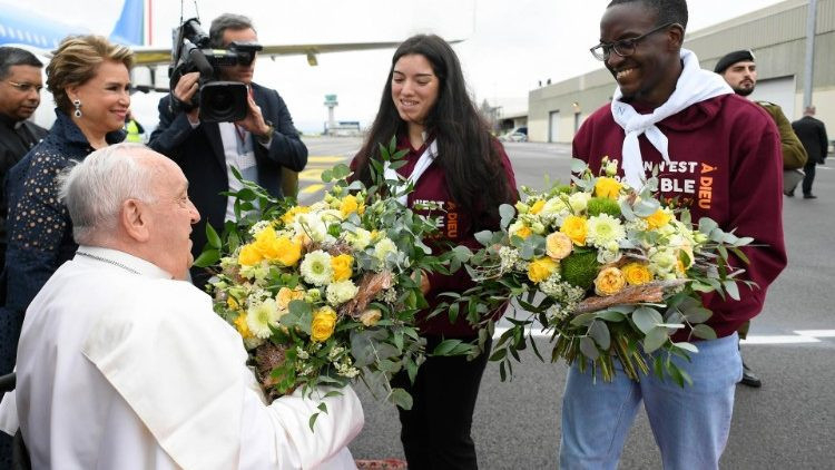 A luxembourgi Findel repülőtéren Ferenc pápát Henrik luxemburgi nagyherceg, Mária Terézia nagyhercegné, Luc Frieden, Luxemburg miniszterelnöke fogadta, és két fiatal, akik virágot nyújtottak át neki.