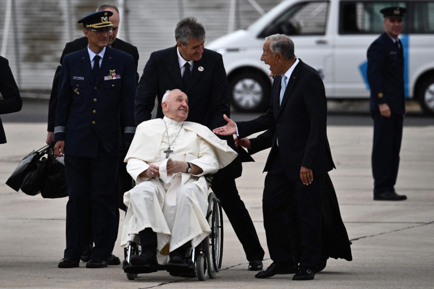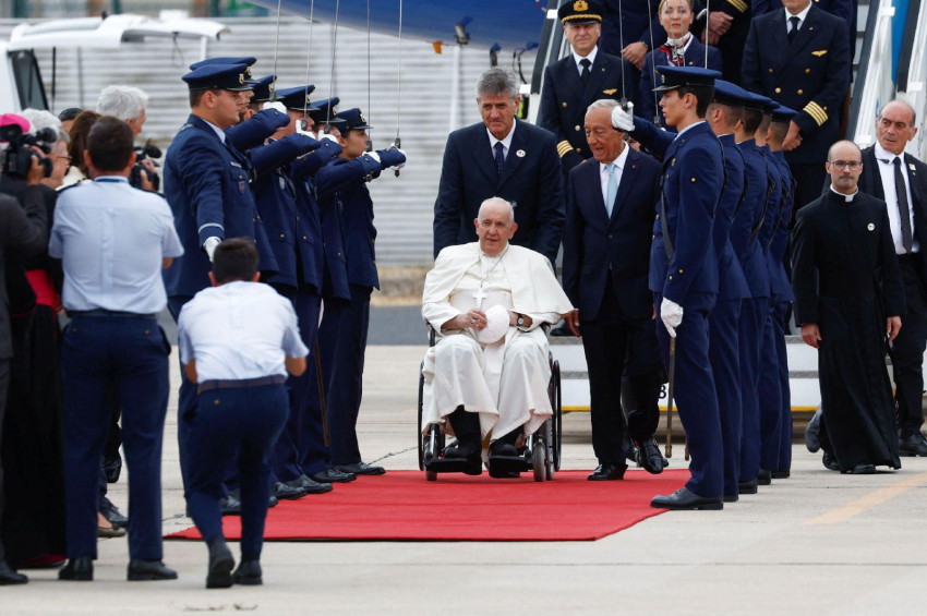 A Szentatyát közvetlenül megérkezése után a belémi nemzeti palotában (a volt királyi palotában) Marcelo Rebelo de Sousa köztársasági elnök köszönti. Szintén a Belém városrészben, a kulturális központban találkozik a Szentatya a hatóságok, a társadalmi élet és a diplomáciai testület tagjaival. 16.45-kor az apostoli nunciatúrán találkozik a miniszterelnökkel, majd 17.30-kor a híres Szent Jeromos-kolostorban vesperást vezet a püspökökkel, papokkal, diakónusokkal, szerzetesekkel és szerzetesnővérekkel, valamint szeminaristákkal és lelkipásztori munkatársakkal.