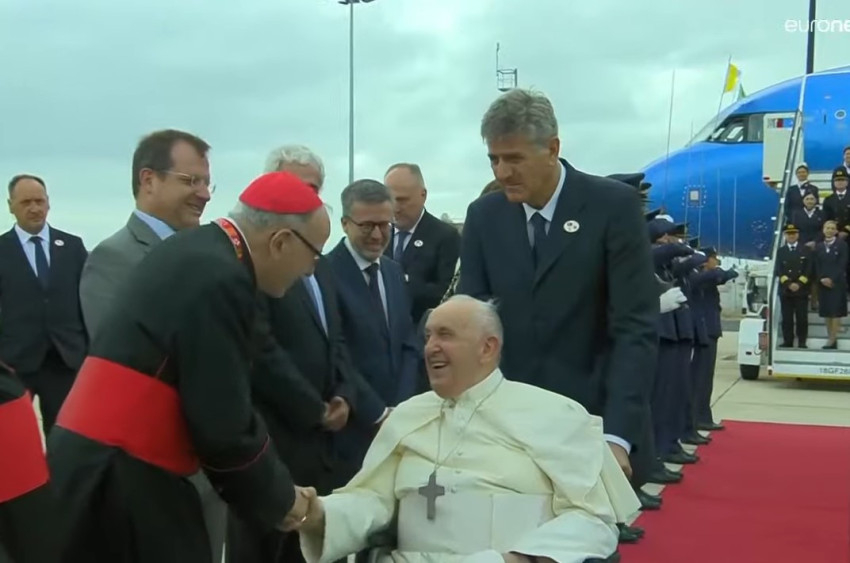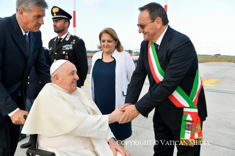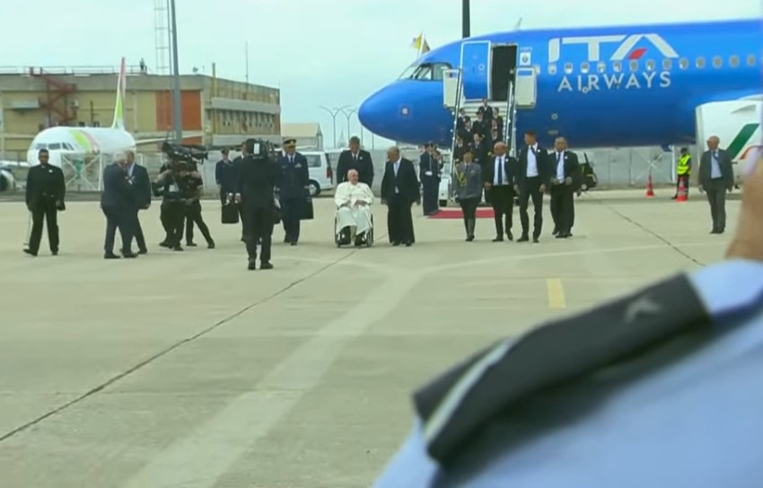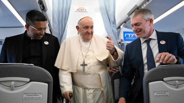 A repülőgépen a Szentatya kíséretében utazik Kevin Joseph Farrell bíboros, a Világiak, a Család és az Élet Dikasztériumának prefektusa; José Tolentino de Mendonça bíboros, a Kultúra és Nevelés Dikasztériumának prefektusa, valamint a hamarosan bíborossá kreálandó Robert Prevost érsek, a Püspöki Dikasztérium prefektusa.