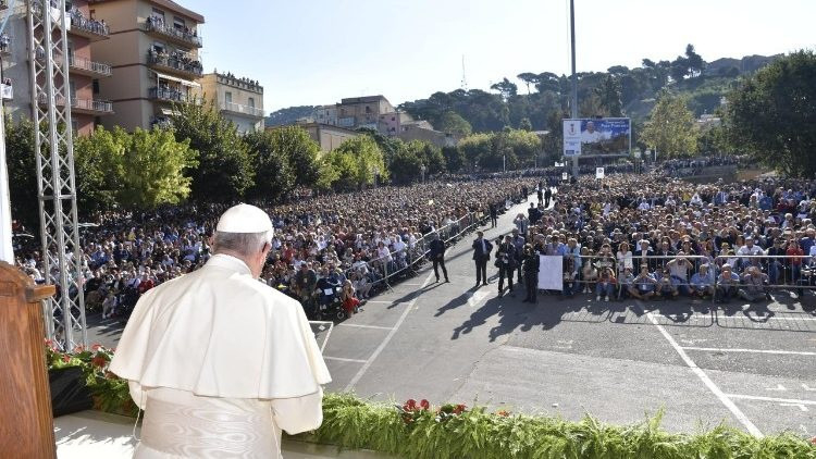 A pápa Piazza Armerina kétszáz éve fennálló egyházmegyéjének híveire a következő feladatot bízta: Jézus iránti szeretetből a végsőkig szolgálják testvéreiket. Felidézte Pino Puglisi vértanú pap emlékét, akit a Cosa Nostra szicíliai maffiaszervezet huszonöt évvel ezelőtt gyilkolt meg.