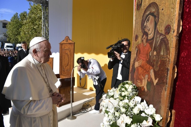 A társadalom és az Egyház súlyos problémáinak megfontolása nem hitelrontó vagy pesszimista cselekedet – fejtette ki Ferenc pápa. – Fel kell ismernünk ezekben az emberi szenvedésekben Urunk sebeit. A keresztények számára Krisztus történelme és teste az üdvösség és a szabadulás helye. Piazza Armerina hívei a keresztekből és a szenvedésből kiindulva kötelezzék el magukat a térség új evangelizálásában. Az egyházmegye bicentenáriumának lezárása után új feladat vár közösségükre.