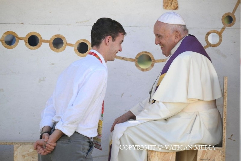 A lisszaboni Vasco de Gama parkban Ferenc pápa meggyóntatta a 21 éves spanyol Franciscót, a 33 éves guatemalai Yesvit és a 19 éves bellunói Samuelt. A kiengesztelődést követően Samuel a Vatican Newsnak elmondta: „Éreztem, hogy a pápa megbocsát. Egyszerű, alázatos és jó ember”. Az olasz fiú 13 éves kora óta él egy közösségben Belluno közelében, mert problémái voltak a szüleivel. Samuel új családra talált, most kertészként dolgozik és füvet nyír. Az ifjúsági világtalálkozón önkéntesként van jelen, az olasz házban fogadja a fiatalokat. Mindezt öt perc alatt mesélte el egy egészen különleges gyóntatónak, a pápának. Samuel még mindig az esemény hatása alatt állt, amikor nyilatkozott, de azt mondta, nagyon boldog, „mert nem minden nap történik, hogy a pápához mész gyónni”, és azért is, hogy láthatta a Szentatyát ilyen közelről. Meg van győződve arról, hogy mától legalább egy kicsit megváltozik az élete. Hangsúlyozta a Vatican News tudósítójának, hogy fontos gyónni.