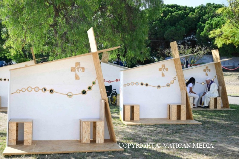 Ferenc pápa pénteken délelőtti első programja az Ibériai-félsziget legnagyobb terén kezdődött, amelyet 1940-ben építettek Portugália történelmének ünneplésére az országban rendezett világkiállításra. Ez a park ad otthon az ifjúsági világtalálkozó egyik legfontosabb mozzanatának: a fiatalok gyónásának. A hatalmas parkban 150 gyóntatószéket állítottak fel, amelyeket a Pasos de Ferreira börtönében fogva tartott fiatalok készítettek újrahasznosított és újrahasznosítható anyagokból olyan módon, hogy akadálymentesek legyenek a fogyatékkal élők számára is.