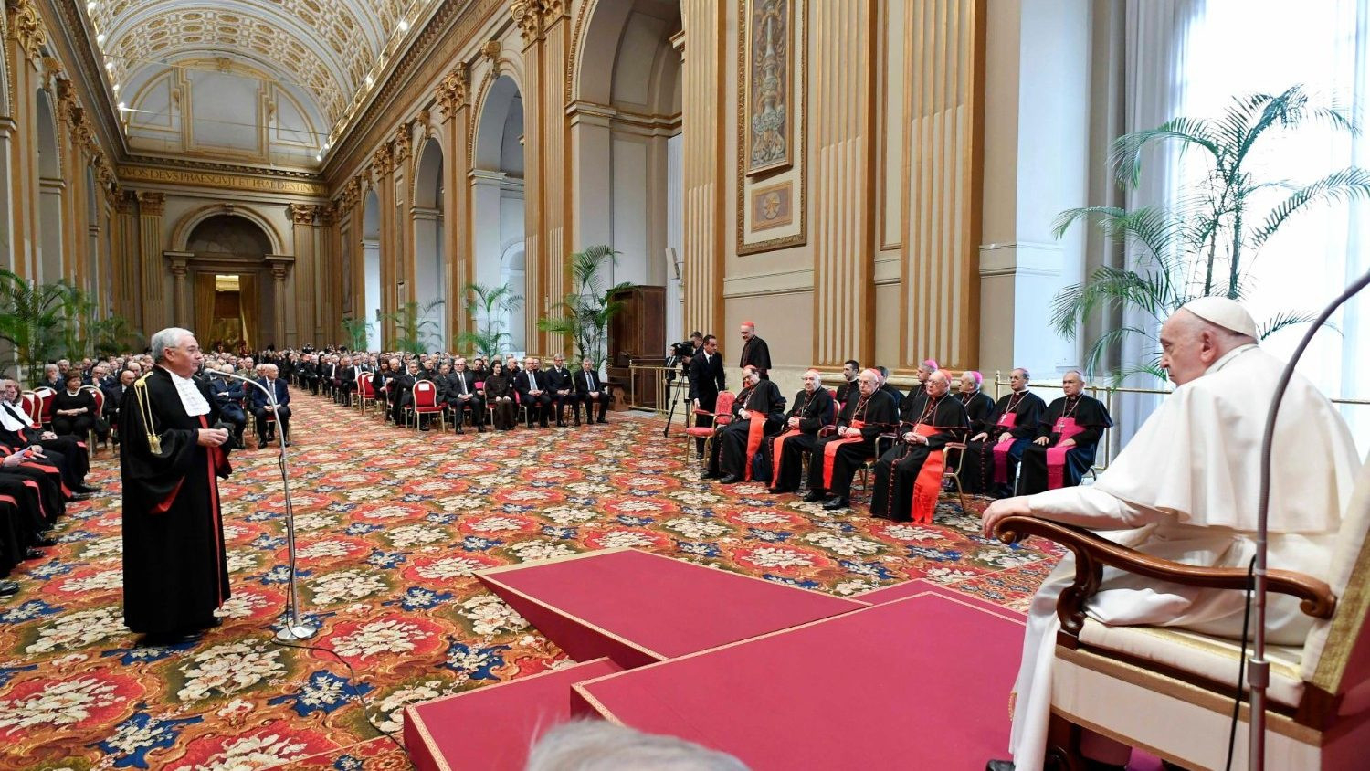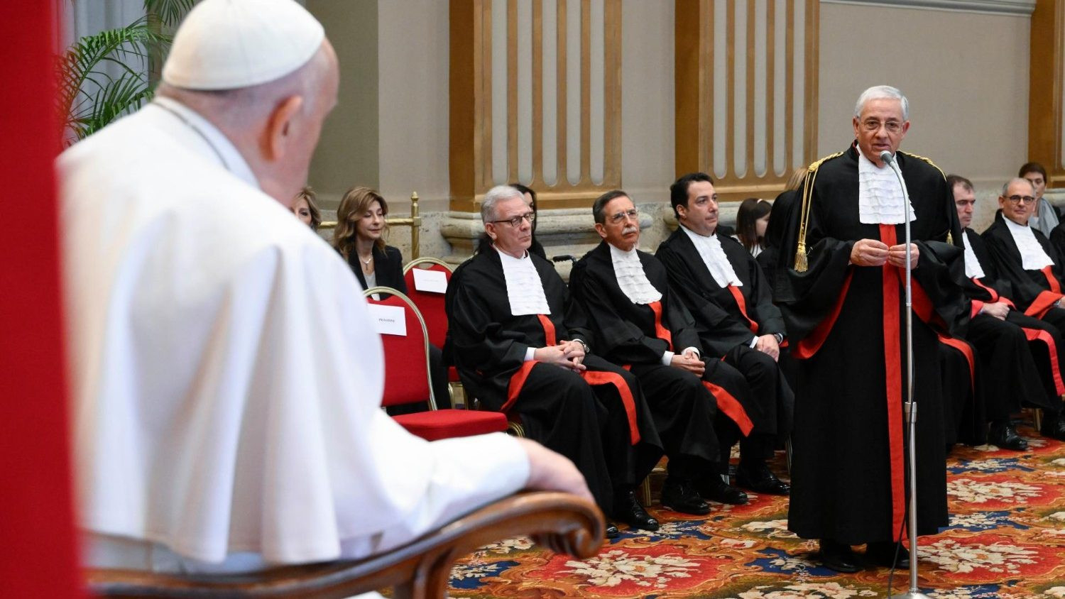 Ugyanilyen bátorságra van szükség, „amikor az eljárás megfelelő lefolytatására törekszünk, és amikor szembe kell néznünk a kritikával”. A külső kritikákra a legjobb válasz „a buzgó hallgatás és a komoly munka iránti elkötelezettség, amely lehetővé teszi törvényszékeink számára, hogy tekintélyes és pártatlan igazságszolgáltatást nyújtsanak, biztosítva a szabályszerű eljárást, miközben tiszteletben tartják a vatikáni jogrendszer sajátosságait”. „Az intézmények erejét és az igazságszolgáltatás szilárdságát az ítélkezés nyugodtsága, a folyamat különböző szakaszaiban az ítélkezésre hivatottak függetlensége és pártatlansága bizonyítja” – mondta a pápa a vatikáni bíráknak.