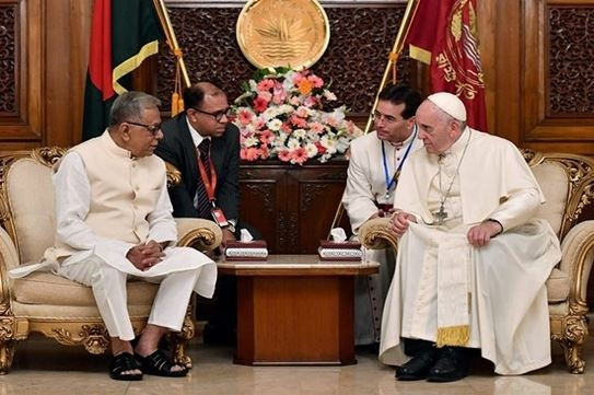 A Szentatya ezután az elnöki palotában udvariassági látogatást tett Abdul Hamid államfőnél. A négyszemközti megbeszélést követően kezdődött meg a pápa találkozója a politikai élet, a diplomáciai testület és a civil társadalom képviselőivel, közel négyszáz meghívott részvételével. Ez volt a csütörtöki nap utolsó programja, amely után az apostoli nunciatúrára, dakkai szálláshelyére utazott a pápa.