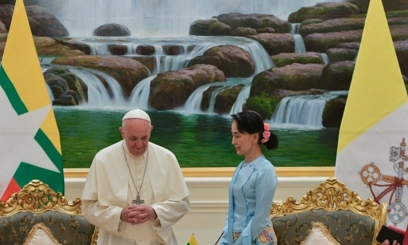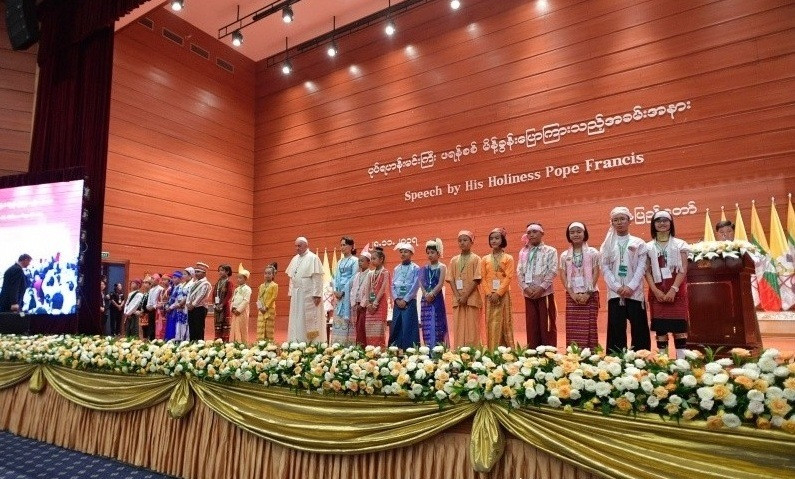 Ferenc pápa elismeréssel szólt Mianmar természeti szépségeiről, számos erőforrásáról, de legnagyobb kincsének az ország népét nevezte, mely történelme során – miként a jelenben is – sokat szenvedett a belső konfliktusok és az ellenségeskedés miatt. Minthogy napjainkra a nemzet elköteleződött a béke megteremtésében, éppen ezért a megosztottság okozta sebek gyógyítása a politika elsőrendű feladata. A Szentatya elismeréssel szólt a kormány azon erőfeszítéseiről, melyekkel – főként a panglongi békekonferencia jegyében – törekszik véget vetni az erőszaknak, bizalmat akar építeni és biztosítani szeretné minden állampolgára számára az alapvető jogokat.