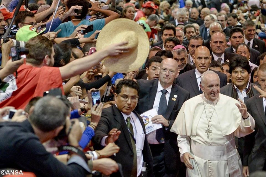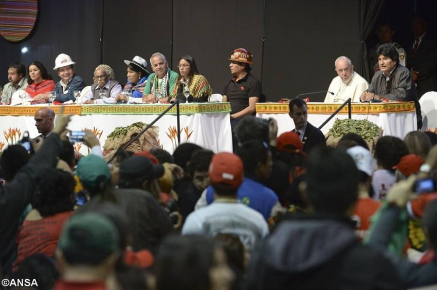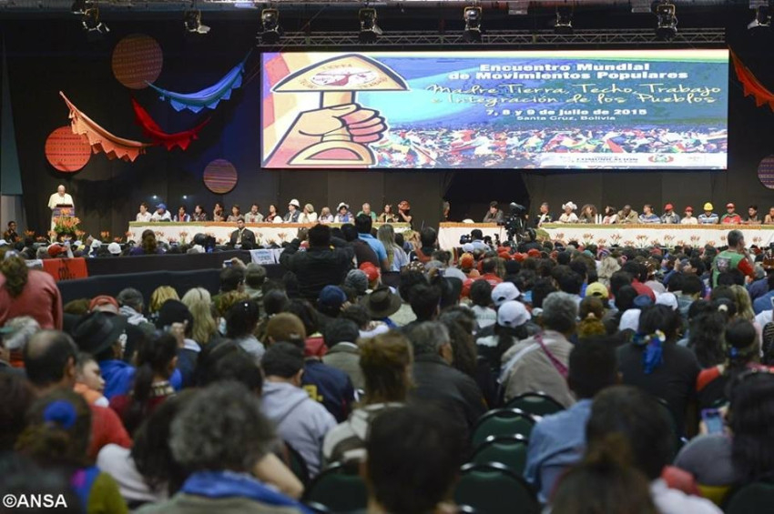 Az emberiség jövője nem pusztán a nagy vezetők, a nagyhatalmak és elitcsoportok kezében nyugszik. Alapvetően a népeken és szervezési képességeiken múlik. Ők vezethetik alázattal és meggyőződéssel a változás folyamatát. Veletek vagyok! Mondjuk együtt szívből: egyetlen család se maradjon fedél nélkül, földműves föld nélkül, dolgozó jogok nélkül, emberek szuverenitás nélkül, egyén méltóság nélkül, gyermek gyermekkor nélkül, fiatal jövő nélkül, idős méltóságteljes öregkor nélkül. Folytassátok a küzdelmet, és nagyon óvjátok a Földanyát! – összegezte Ferenc pápa a népmozgalmak képviselőihez intézett beszédét Santa Cruzban.