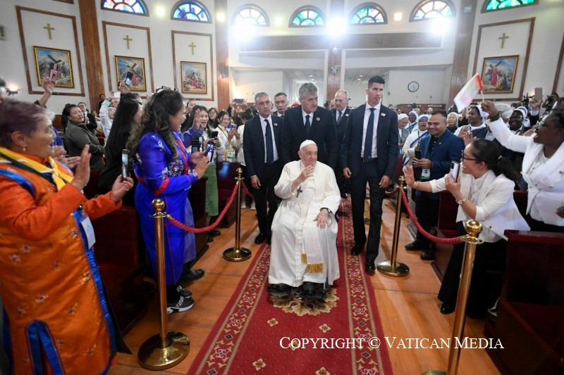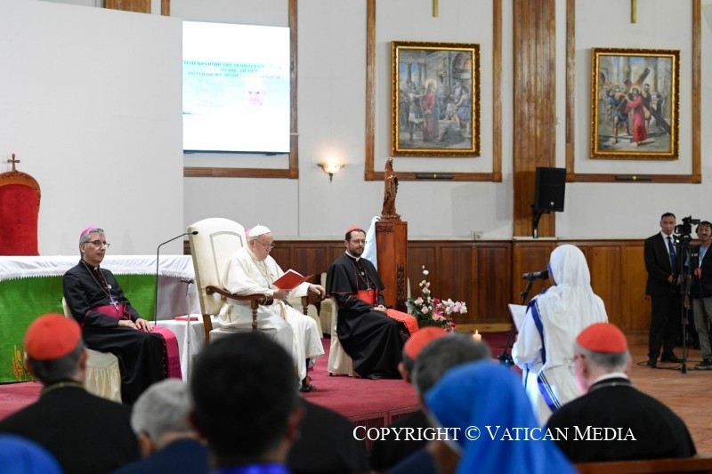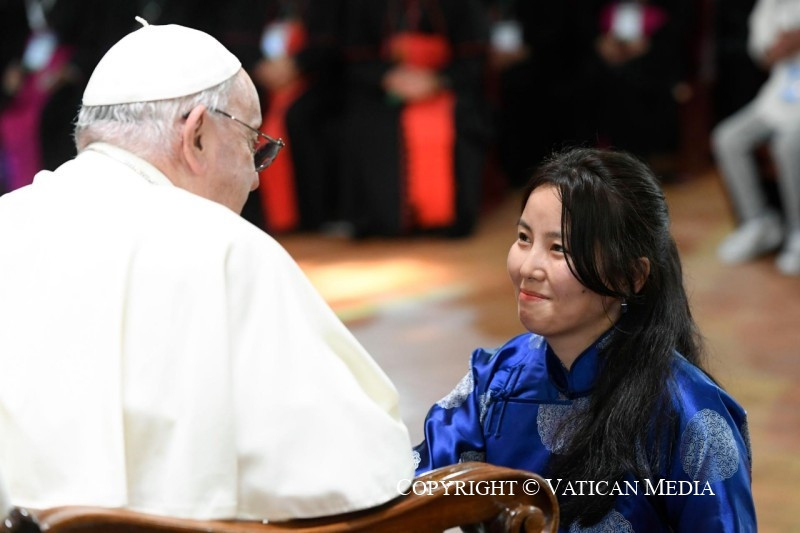 Köszönöm, Excellenciás Püspök Úr, a szavait, köszönöm Sage nővér, Peter Sanjaajav atya és Rufina tanúságtételét, és köszönöm mindnyájatoknak, hogy itt vagytok, és köszönöm a hiteteket! Örülök, hogy találkozhatom veletek! Az evangélium öröme az oka annak, hogy ti, megszentelt férfiak és nők a szerzetes életben és a felszentelt szolgálatban itt vagytok, s világi nővéreitekkel és testvéreitekkel együtt az Úrnak és az embereknek szentelitek magatokat. Áldom Istent ezért. Ezt egy szép dicsőítő imán, a harmincnegyedik zsoltáron keresztül teszem, belőle merítek ihletet, hogy néhány gondolatot megosszak veletek. Így biztat ez a zsoltár: „Ízleljétek és lássátok, milyen jó az Úr” (Zsolt 34, 9).