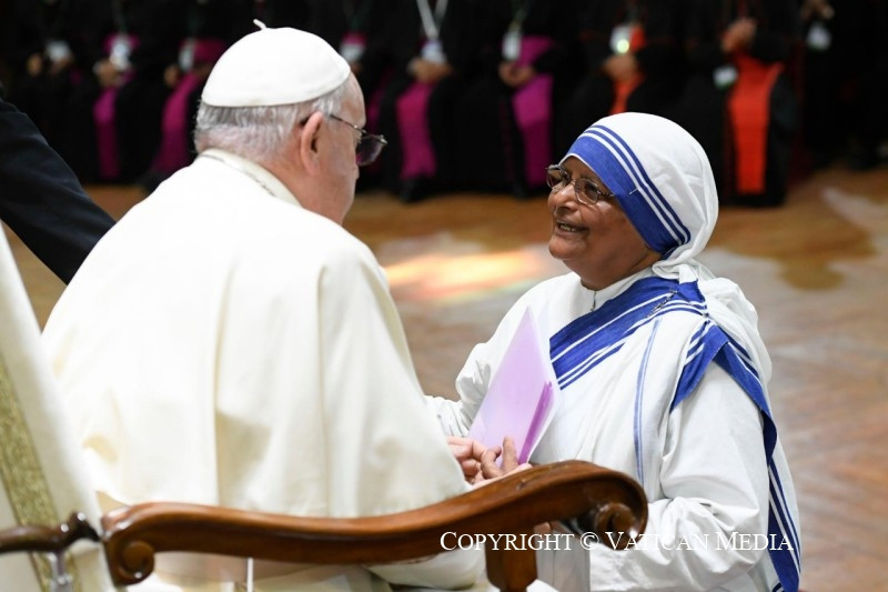 De miért áldozzuk életünket az evangéliumért? Ezt a kérdést teszem fel nektek. Ahogy Rufina mondta, a keresztény élet úgy fejlődik, hogy folyton kérdéseket tesz fel, mint a gyerekek, akik mindig új dolgokat kérdeznek, mert nem értenek mindent a miértek életszakaszában. És a keresztény élet közeledik az Úrhoz, állandóan kérdéseket tesz fel, hogy jobban megértse az Urat, jobban megértse üzenetét. Azért áldozzuk életünket az evangéliumért, mert megízleltük (vö. Zsolt 34) azt az Istent, aki láthatóvá, megérinthetővé, megtalálhatóvá tette magát Jézusban. Igen, ő a minden népnek szánt örömhír, melynek továbbadásával nem állhat le az Egyház. Meg kell testesítenie az egyének és kultúrák életében, és „bele kell súgnia” az egyének és kultúrák szívébe. Isten beszédmódja sok esetben a lassú suttogás, mely időt vesz igénybe; ő így beszél. Isten Krisztusban megmutatkozó szeretetének ez a megtapasztalása tiszta fény, mely átváltoztatja és ragyogóvá teszi az arcot. Testvéreim és nővéreim, a keresztény élet ennek az arcnak a szemléléséből születik, a szeretetről szól, mindennapi találkozásról az Úrral az isteni igében, az élet Kenyerében és a másik ember arcában, a rászorulókban, akikben Jézus jelen van. Erre emlékeztettél bennünket, Salvia nővér, tanúságtételeddel, köszönjük! Több mint húsz éve vagy itt, és megtanultál beszélni ezekkel az emberekkel: köszönjük!