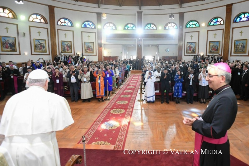 Vissza kell térnünk a forráshoz, Jézus arcához, ízlelendő jelenlétéhez: ő a mi kincsünk (vö. Mt 13,44), a drágagyöngy, melyért érdemes mindent eladni (vö. Mt 13,45–46). Mongóliában élő testvéreitek és nővéreitek, akiknek erős érzékük van a szent iránt, és – az ázsiai földrészre jellemző módon – nagy és gazdag vallási történelmük van, várják tőletek ezt a tanúságtételt, és fel tudják ismerni annak hitelességét. Tanúságot kell tennetek, mert az evangélium nem térítés [prozelitizmus], hanem tanúságtétel által növekszik.