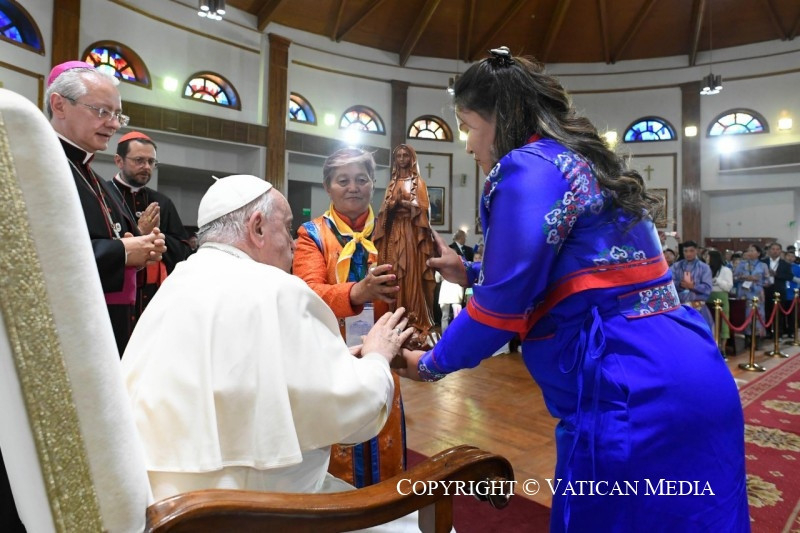 Szeretteim, ezen a tanítványi-misszionáriusi úton biztos támaszotok van: mennyei édesanyánk, aki – nagy örömmel láttam – csendes és gondoskodó jelenlétének kézzelfogható jelét akarta adni nektek azáltal, hogy egy szeméttelepen hagyta a képmását. A Szeplőtlen Szűzanyának ez a gyönyörű szobra jelent meg a hulladékok helyén: ő, aki makulátlan, bűntől mentes, olyan közel akart lenni, hogy a társadalom szemetével keveredett, és a hulladék szennyéből Isten anyjának, a mennyei édesanyának a tisztasága emelkedett ki. Megismerhettem a suun dalai ijii, a tejóceán nagyságú szívvel rendelkező anya érdekes mongol hagyományát. Ha – A mongolok titkos történetének elbeszélésében – a ger felső nyílásán keresztül leereszkedő fény megtermékenyíti a mitikus Alungoo királynőt, ti Szűz Mária anyaságában annak az isteni fénynek a működését szemlélhetitek, amely felülről kíséri nap mint nap egyházatok lépteit.