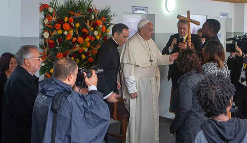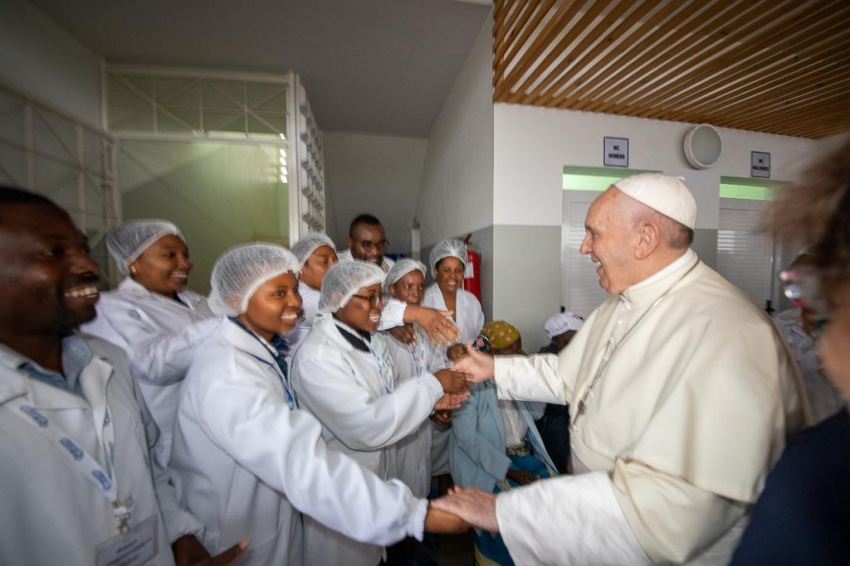„Szeretettel üdvözlöm a vezetőket, az egészségügyi dolgozókat, a betegeket és családjaikat, és minden jelenlévőt – kezdte beszédét a Szentatya. – Amikor látom, milyen nagy szakértelemmel, profizmussal és szeretettel gondozzátok és fogadjátok a betegeket, konkrétan a HIV-fertőzötteket, főként asszonyokat és gyermekeket, az irgalmas szamaritánus példája jut eszembe… Mindenki, aki bejön ide, aki elkeseredetten, félelemmel telve érkezik, hasonlít az útszélen hagyott emberre. És ti nem kerültétek ki távolról, nem folytattátok az utatokat, mint mások, a levita és a pap. Ez a központ arról tanúskodik, hogy volt, aki megállt és együttérzett, aki nem engedett a kísértésnek, ami azt súgta: »itt nincs mit tenni«, »lehetetlen begyógyítani ezt a nagy sebet«, hanem bátran nekivágott, hogy megoldásokat keressen.”