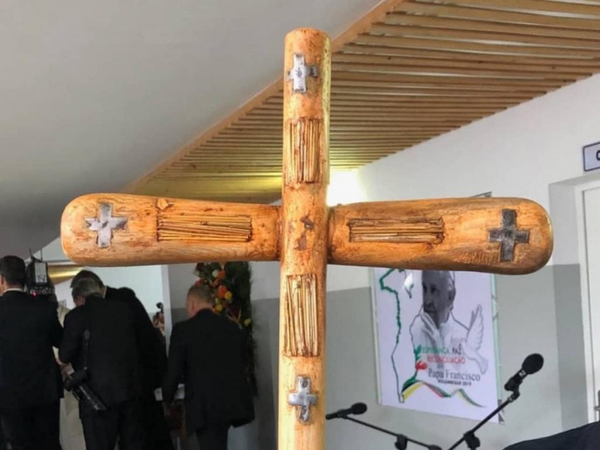 Látogatása végén Ferenc pápa ajándékot kapott: egy keresztet formáló pásztorbotot, amelyhez felhasználták a márciusban Beira város környékén pusztító Idai ciklon által lerombolt házakról származó bádoglemezeket és szalmát is.