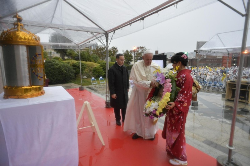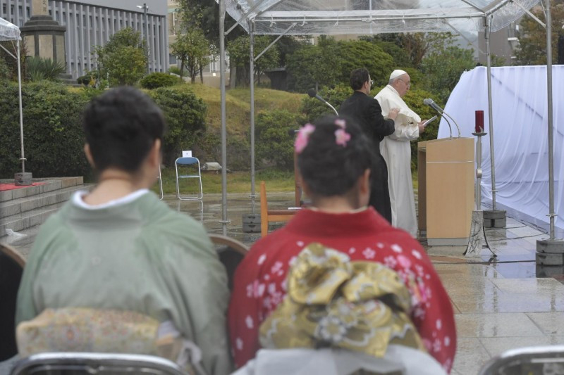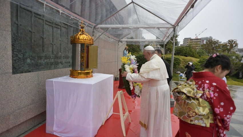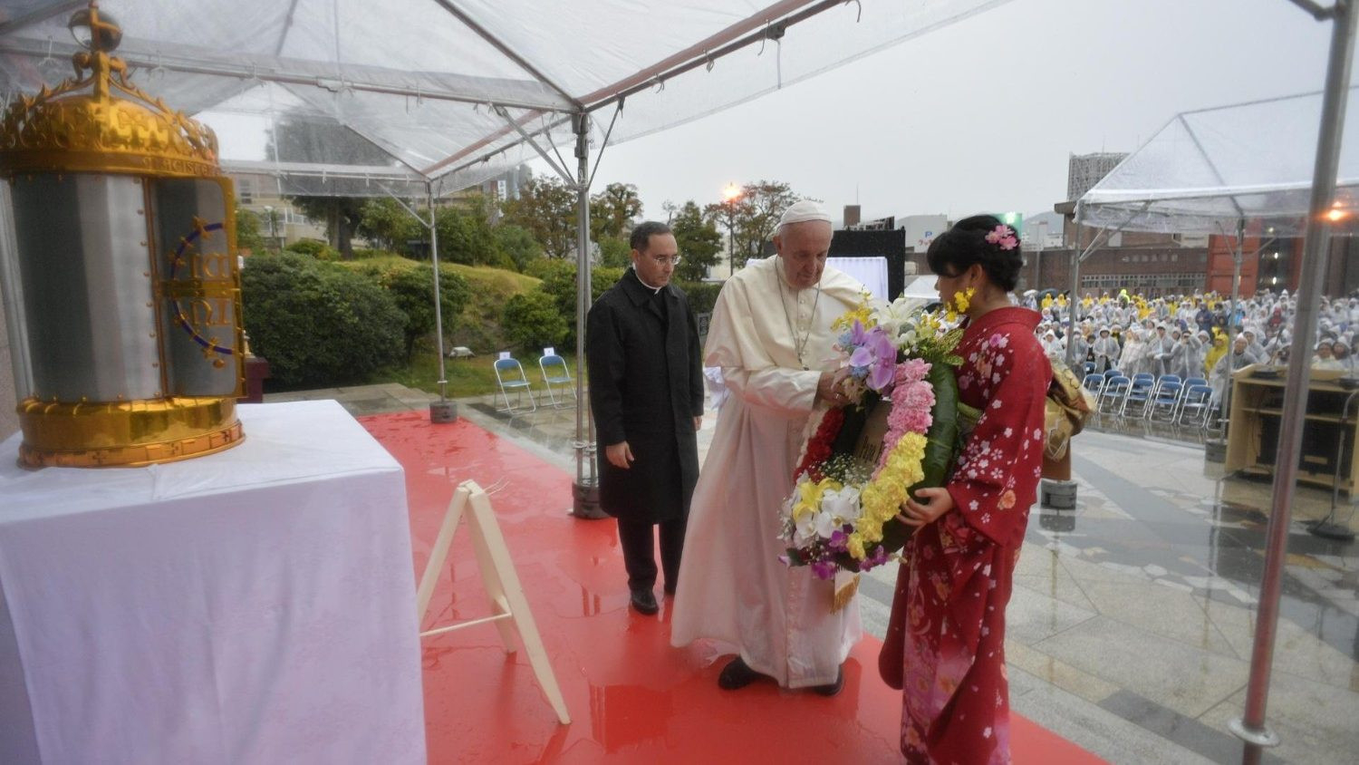 Azért jövök ehhez a vértanúknak szentelt emlékműhöz, hogy találkozzam ezekkel a szent férfiakkal és nőkkel, és annak a fiatal jezsuitának a „kicsinységével” akarom ezt tenni, aki „a föld határairól” jött, és mélységes inspiráló és megújulást szolgáló forrásra lelt az első japán vértanúk történetében. Ne felejtsük el az áldozatban megmutatkozó szeretetet!
