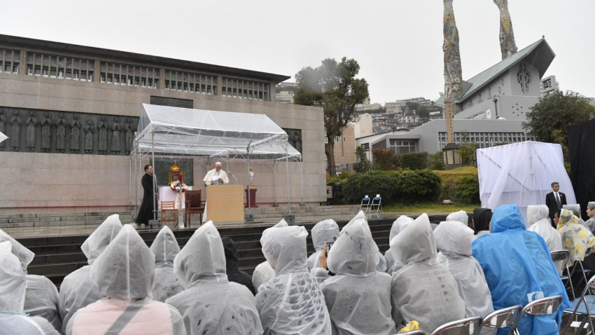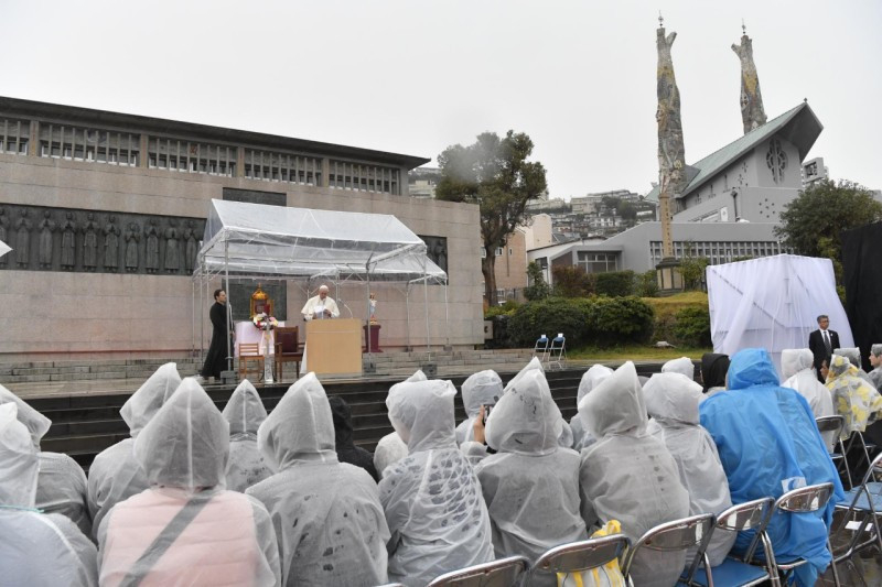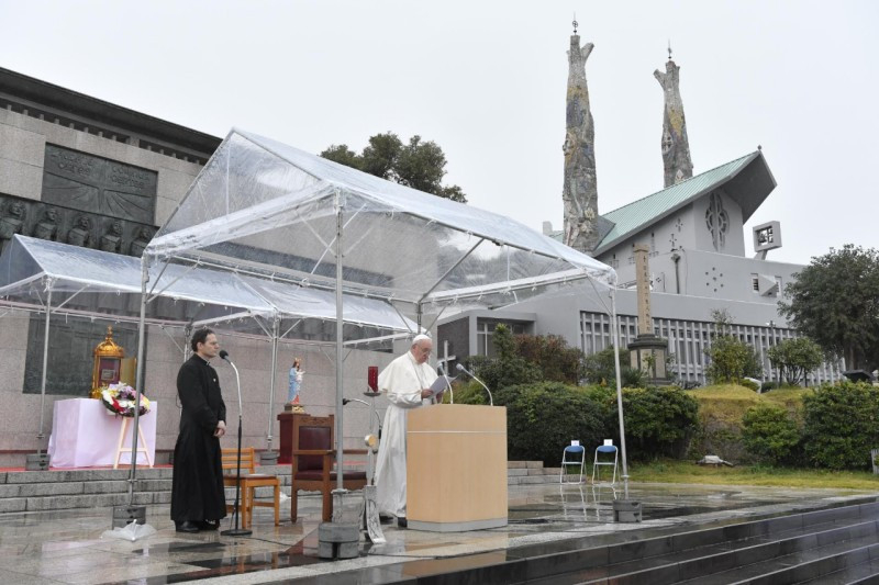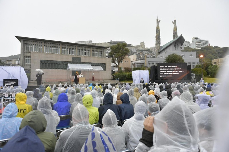 Nagaszaki atombomba-tragédiájának helyszínétől három kilométerre fekszik az a hely, amely Miki Szent Pálnak és társainak, a „japán vértanúknak” állít emléket. A Nisizaka-dombon 1597. február 5-én az akkori fiatal japán egyház 26 tagját végezték ki, 17 japán keresztényt és kilenc európai szerzetest. Haláluk egy hosszú, két évszázadon át tartó véres keresztényüldözés nyitánya volt. A vörös téglákból épített hatalmas emlékműbe a kereszt függőleges száraként foglalták egymás mellé a 26 vértanú ember nagyságú bronz domborműveit. A zuhogó eső ellenére több ezer zarándok várta a Szentatyát a helyszínen.