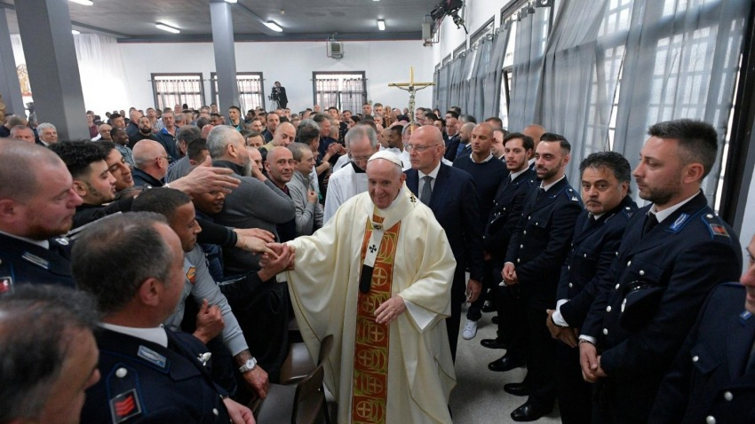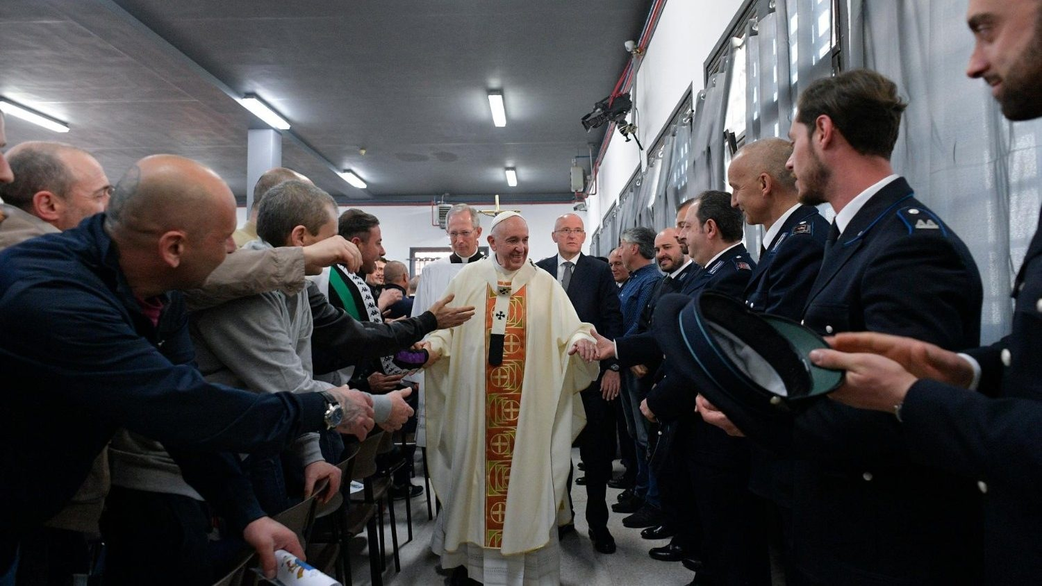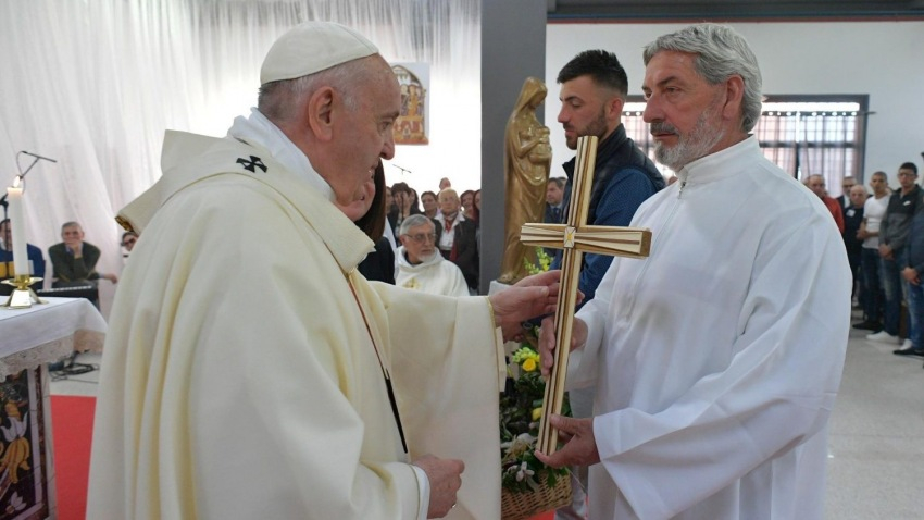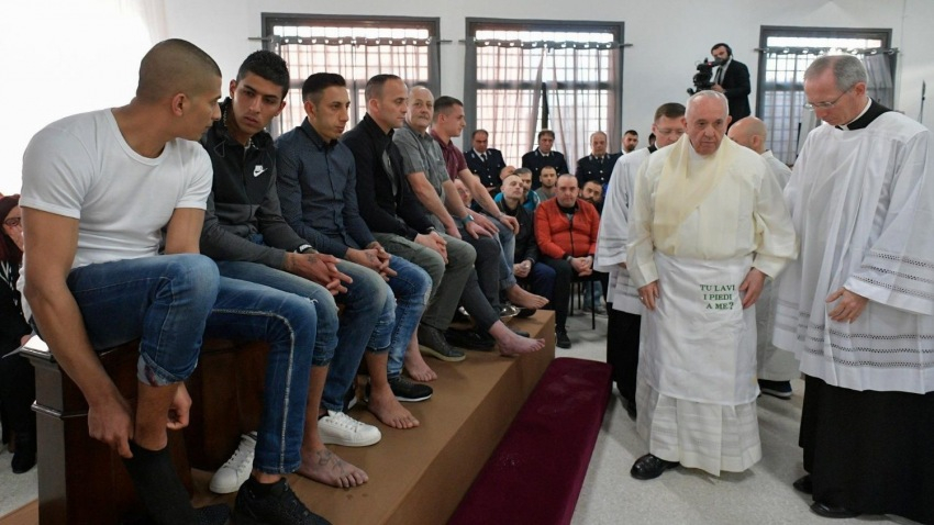 Hallottuk, mit tett Jézus. Érdekes, azt mondja az evangélium: „Jézus tudta, hogy az Atya mindent a kezébe adott”, vagyis Jézusé volt minden hatalom, minden. És azután elkezdi a lábmosást. Olyan cselekedet ez, amelyet a rabszolgák végeztek abban a korban, mert akkoriban nem voltak leaszfaltozva az utak, és a házba érkező embereknek poros volt a lába. Amikor valaki látogatóba vagy ebédre érkezett, a rabszolgáknak volt a dolga, hogy megmossák a lábát. És Jézus ezt a tettet hajtja végre: megmossa lábukat. A rabszolgák feladatát veszi át. Ő, akinek kezében volt minden hatalom, ő, aki az Úr volt, rabszolgamunkát végez. És aztán ezt tanácsolja mindenkinek: „Ezt tegyétek ti is egymás közt!” Vagyis szolgáljátok egymást, legyetek testvérek a szolgálatban, ne a nagyra törekvésben, vagyis ne akarjatok mások fölé kerekedni, másokat elnyomni, nem, hanem legyetek testvérek a szolgálatban! Szükséged van valamire? Rászorulsz valamilyen szolgálatra? Majd én megcsinálom neked! Ez a testvériség. A testvériség alázatos, mindig: szolgál. És én azért végzem el ez a cselekedetet – az Egyház azt akarja, hogy a püspök minden évben elvégezze, egyszer egy évben, legalább nagycsütörtökön –, hogy utánozzam Jézus tettét. És a püspök azért is teszi ezt, hogy jót tegyen a példával magának is, mert a püspöknek nem a legfontosabbnak kell lennie, hanem a legszolgálóbbnak! És mindannyiunknak a többiek szolgájának kell lennünk!