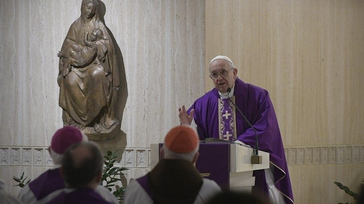 A Mózes próféta könyvéből vett olvasmány (Szám 21,4–9) az Egyiptomból való kivonulás idején tapasztalt nehézségekről szól. Isten népe belefáradt a vándorlásba. A kezdeti lelkesedés és remény, melyet a fogságból való kiszabadulás miatt éreztek, fokról fokra elapadt, ahogy a tengerpartra, majd a pusztaságba értek, és elkezdtek zúgolódni Mózes ellen. A fáradtság elveszi tőlünk a reményt – emelte ki a pápa. A fáradtság szelektívvé tesz: csak a rossz dolgokat vesszük észre, és elfelejtjük mindazt a jót, amiben részünk volt.