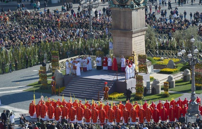 A szertartás a tér közepén álló obeliszk tövénél kezdődött, az Úr jeruzsálemi bevonulásának emlékére. Az ünnep olasz neve: Domenica delle Palme, vagyis pálmavasárnap, mert a zöld pálmaág a győzelem és megdicsőülés jelképe. Ugyanakkor a szenvedés és a halál ünneplése is ez a nap, amelynek látható jele a vértanúságra emlékeztető piros miseruha és a szentmise során felhangzó passió, Urunk szenvedéstörténete.