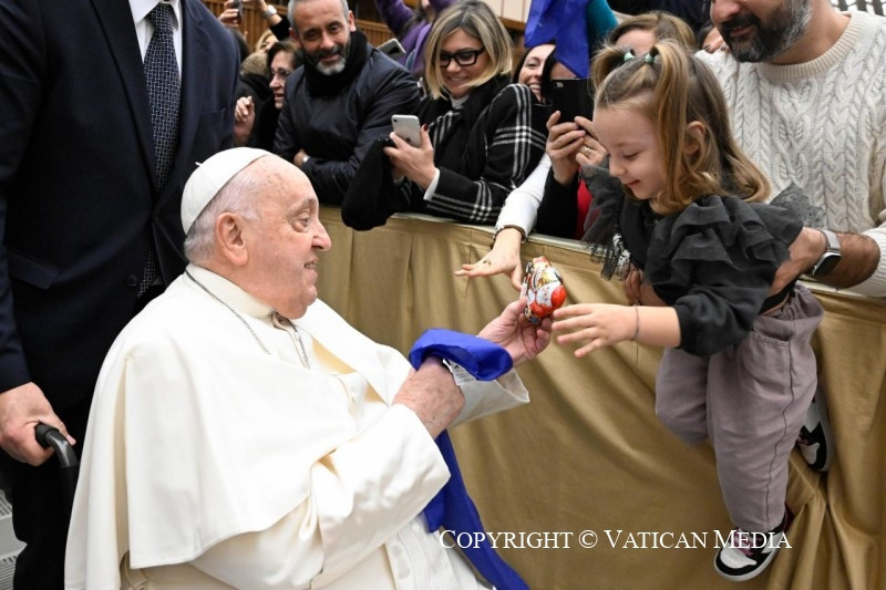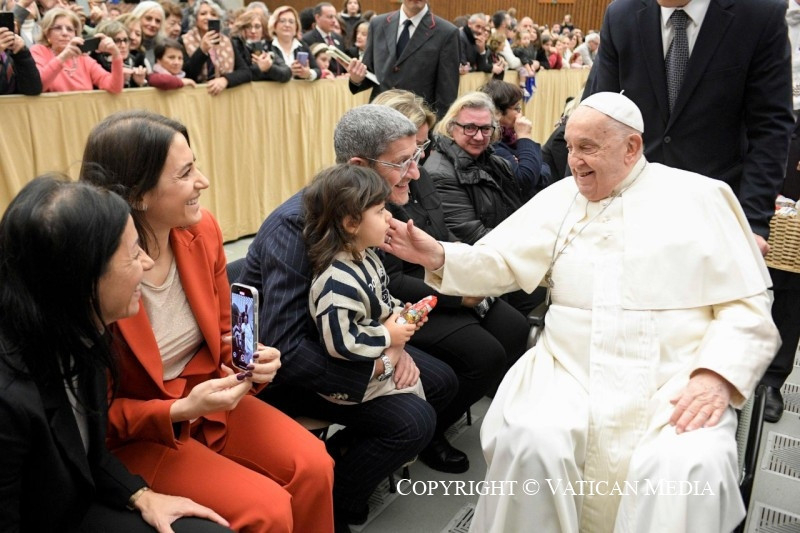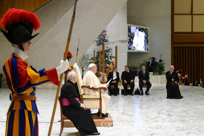 A karácsony arra tanít bennünket, hogy a nagyság nem a sikerben vagy a gazdagságban nyilvánul meg, hanem a szeretetben és a mások iránti szolgálatban. Isten pedagógiája az ajándékozás pedagógiája, meghívás arra, hogy közösségben éljünk vele és másokkal, az egyetemes testvériség projektjének részeként, egy olyan projekt részeként, amelyben a családnak központi és pótolhatatlan helye van. A család! Továbbá ez a pedagógia felhívás arra, hogy ismerjük el minden ember méltóságát – kezdve azokkal, akiket eldobnak és kirekesztenek, ahogyan kétezer évvel ezelőtt a pásztorokkal bántak –, és hogy értékeljük az összes életszakasz értékét, beleértve a gyermekkort is. A család a középpont, ne felejtsétek el! Mesélte nekem valaki, hogy egy vasárnap egy étteremben ebédelt, és a szomszéd asztalnál egy család ült: apa, anya, a fiuk és a lányuk. Mind a négyen a mobiltelefonjukba bújtak, nem beszéltek egymással, a mobiltelefonjukkal voltak elfoglalva. Ez az úr hallott valamit, odament hozzájuk, és azt mondta: „Dehát ti család vagytok! Miért nem egymással beszélgettek, miért a mobiltelefonotokba bújtok? Ez furcsa!” Meghallgatták, elküldték a pokolba, és folytatták, mintha mi sem történt volna. Kérlek benneteket, beszélgessetek egymással a családban! A család párbeszéd, a beszélgetés által fejlődünk.