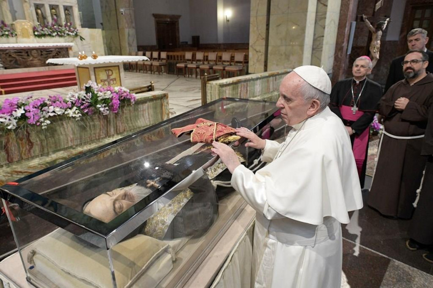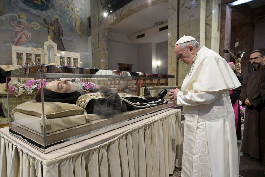 Az olvasmányban Isten azt is elmagyarázza, honnan kell merítenünk az élet bölcsességét: „Aki dicsekedni akar, azzal dicsekedjen, hogy […] ismer engem” (Jer 9,23). Ismerni őt, vagyis találkozni vele, mint megmentő és megbocsátó Istennel: ez a bölcsesség útja. Az evangéliumban Jézus így biztat: „Gyertek hozzám mindnyájan, akik fáradtak vagytok és terhektől roskadoztok” (Mt 11,28). Ki érezheti magát közülünk kizárva ebből a meghívásból? Ki mondhatja: „Nekem nincs rá szükségem”? Szent Pio felajánlotta életét és számtalan szenvedését, hogy testvérei találkozhassanak az Úrral. A találkozás elősegítésének legfőbb eszköze pedig a gyónás, a kiengesztelődés szentsége volt. Ott kezdődik el és kezdődik újra a bölcs élet, mely megtapasztalja Isten szeretetét és bocsánatát, ott kezdődik el a szív gyógyulása. Pio atya a gyóntatószék apostola volt. Ma is oda hív minket, és azt mondja: „Hová mész? Jézushoz vagy a szomorúságaidhoz? Kihez térsz vissza? Ahhoz, aki megment téged, vagy csüggedéseidhez, bánataidhoz, bűneidhez? Gyere, gyere, az Úr vár téged! Bátran, nincs olyan súlyos ok, mely kizárna téged irgalmasságából!”