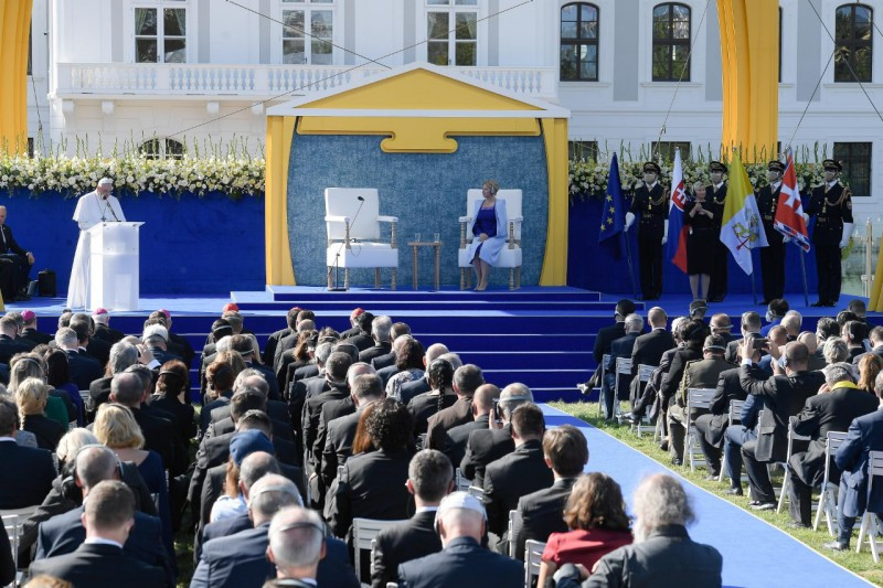 Ferenc pápa beszédében Szlovákia küldetésére utalva elmondta, hogy egy fiatal, de mély gyökerekkel rendelkező országba érkezett. Emlékezett arra, hogy 28 éve a világ csodálattal figyelte, hogy két ország háborúskodás nélkül is képes szétválni. Utalva Szent Cirill és Metód szerepére Európa védőszentjeiként, a Szentatya arra hívta a jelenlévőket, hogy az ország küldetése, hogy a béke követe legyen a kontinens szívében. A két szent példája is rávilágít, hogy a jó megőrzése nem a múlt javítását, hanem az újra való nyitottságot jelenti, anélkül, hogy elvesztenénk gyökereinket.