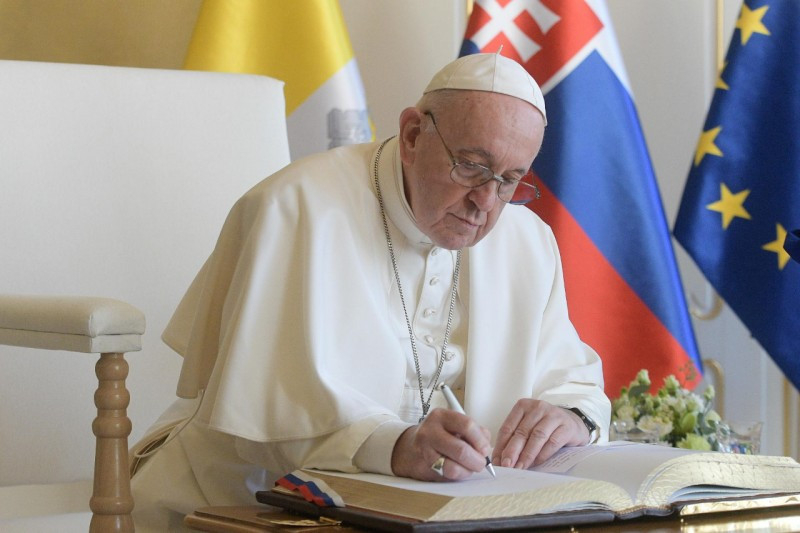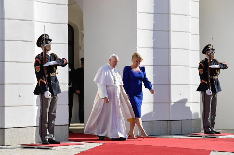 Szeptember 13-án, hétfőn reggel Pozsonyban az elnöki hivatalnak otthont adó Grassalkovich-palotában Zuzana Čaputová köztársasági elnök fogadta Ferenc pápát. A Szentatya üdvözlését követően az épület aranytermében négyszemközti találkozóra került sor, itt a pápa a palota emlékkönyvébe a következő szavakat írta: