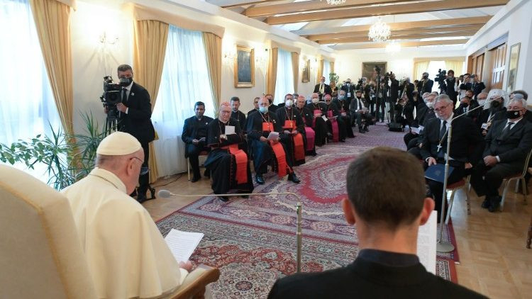 Ferenc pápa „az ateista üldöztetés évei után újraindult közösségek útjának nehézségeiről” is szólt, és azt is hozzátette, most azt lehet látni, hogy „milyen nehéz megélni a hitet a visszanyert szabadság világában”.