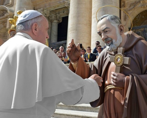 Ferenc pápa beszédeiben és homíliáiban mindeddig soha nem idézte Pietrelcinai Pio atyát, mégis ő volt az, aki az irgalmasság szentévében a Szent Péter-bazilikába vitette a stigmák szentjének földi maradványait. Ingrao, a Panorama hetilap Vatikán-szakértője ezt a rejtélyesnek mondható kapcsolatot vizsgálta. Kiindulópontnak azt a mondatot választotta, amelyet Ferenc pápa 2014 áprilisában, Pio atya fából készült szobrának megáldásakor mondott: „Pio atya, most közelebb vagyunk egymáshoz, én megáldalak téged, te pedig védelmezz engem!”