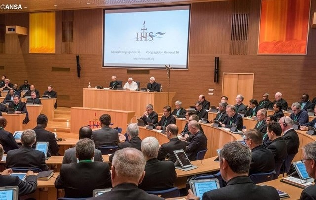 Ferenc pápa nem vesz részt az általános rendgyűlésen, de a hozzájuk intézett beszédében a jezsuita rend hagyományára, rendalkotmányára, a pápák jezsuitákhoz intézett beszédeire, valamint a ma időszerű missziójuk alapvető szempontjaira emlékeztette őket. Spanyol nyelvű beszéde után Ferenc pápa válaszolt a hozzá intézett kérdésekre, majd az ebédet a kúrián egykori rendtársai körében fogyasztotta el.