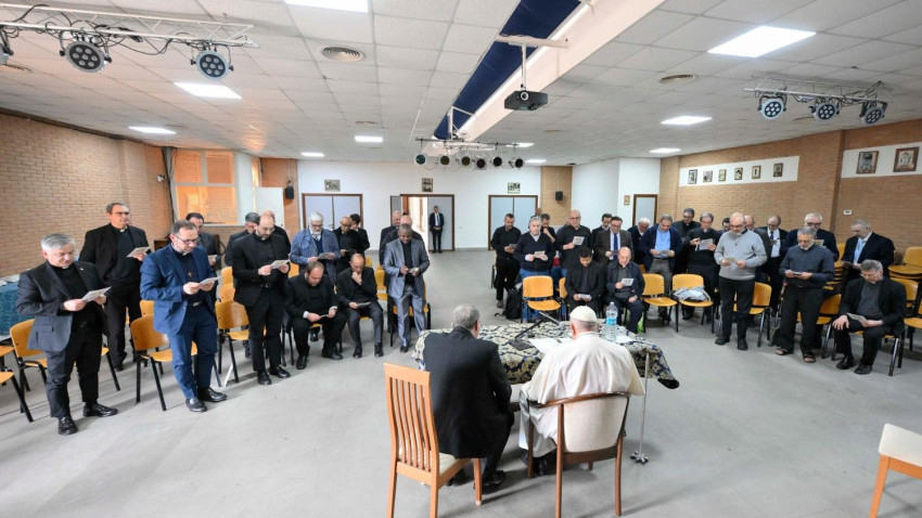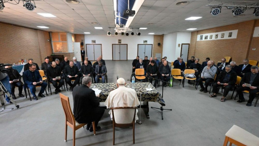 A prefektúra 35 papjával és diakónusaival – hasonlóan az előző plébániai látogatásokhoz – körülbelül másfél órán át beszélgetett Ferenc pápa, zárt ajtók mögött. Imádság és a Szentlélek hívása után válaszolt a főként lelkipásztori jellegű kérdésekre.
